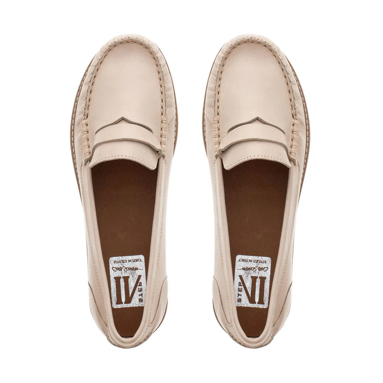 - Round toe, loafer silhouette, penny-trim detail, wedge-style, tonal stitching, logo branding, smooth finish