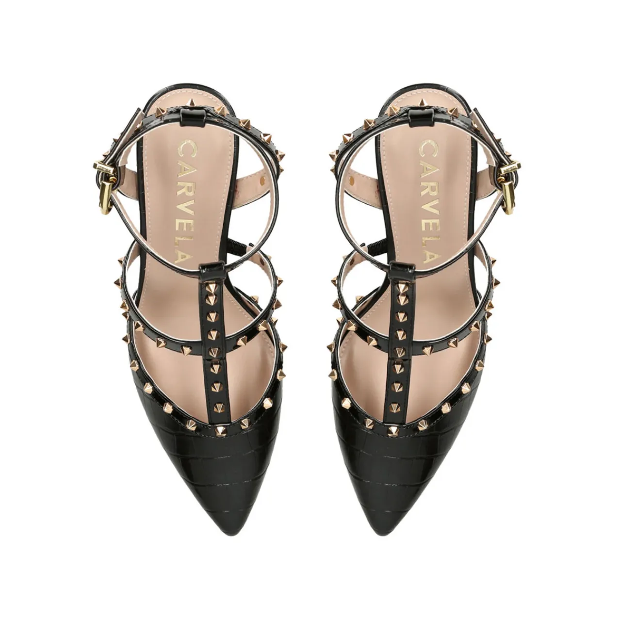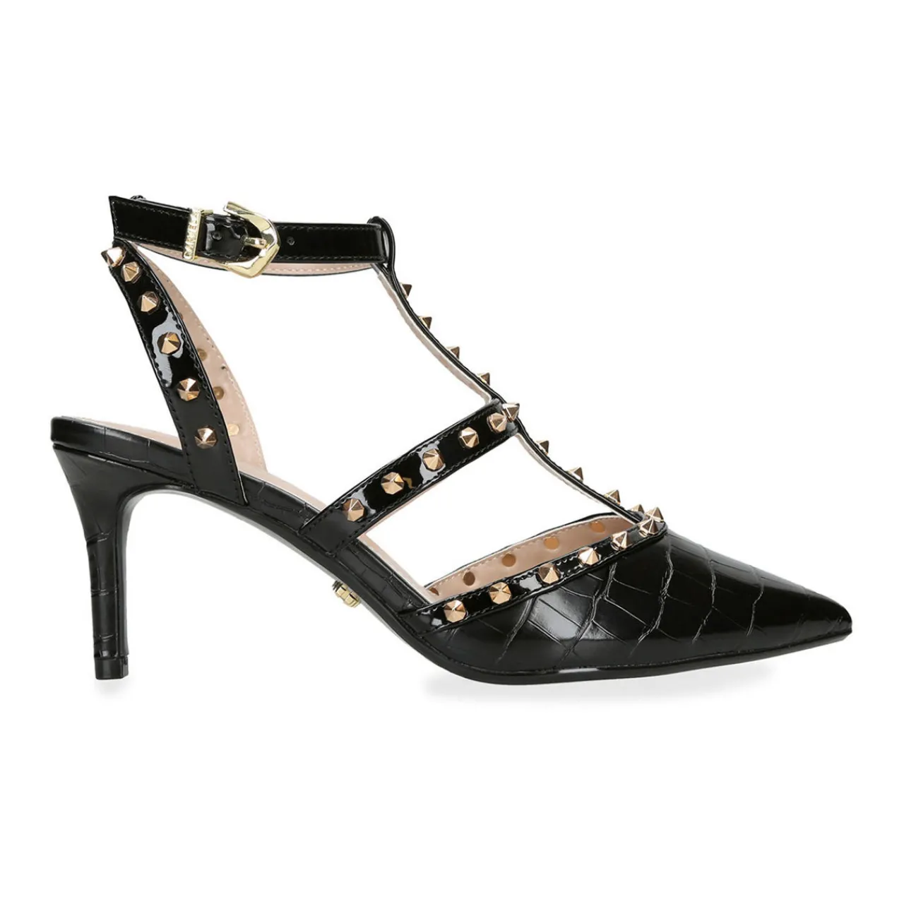 - Adjustable buckle strap, enclosed pointed toe, Icon C stud on the outsole, statement gold studs across the straps, stiletto heel