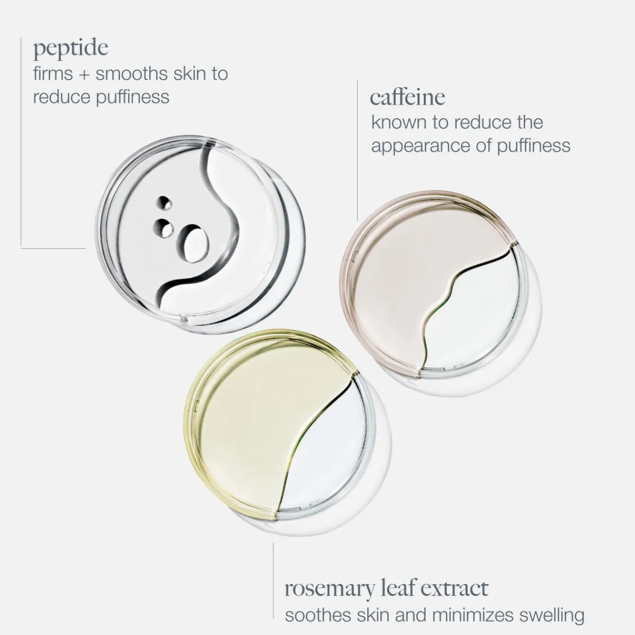 - Tetrapeptides and soothing Rosemary Leaf Extract: A highly active blend that minimises the appearance of puffiness and fine lines. Bioengineered Succinic Acid blend: supports a more radiant appearance. Voandzia Subterranea Seed Extract: leaves skin smoother and more luminous. Caffeine: known to reduce the appearance of puffiness