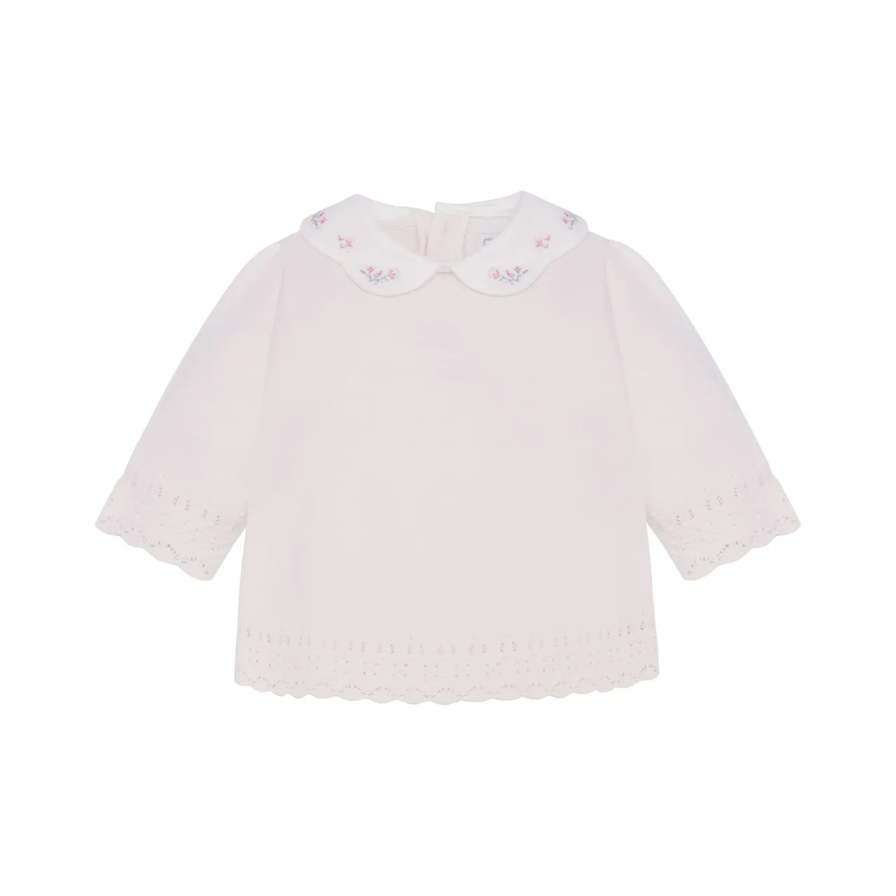 - Sweater: Knitted, lace pattern, scalloped edges, floral spray, embroidered scalloped collar, pearlised buttons. Leggings: Foot-in style, textured patterned, stretch-fused waistband. Hat: Pull-on style, scalloped trim, lace detailing