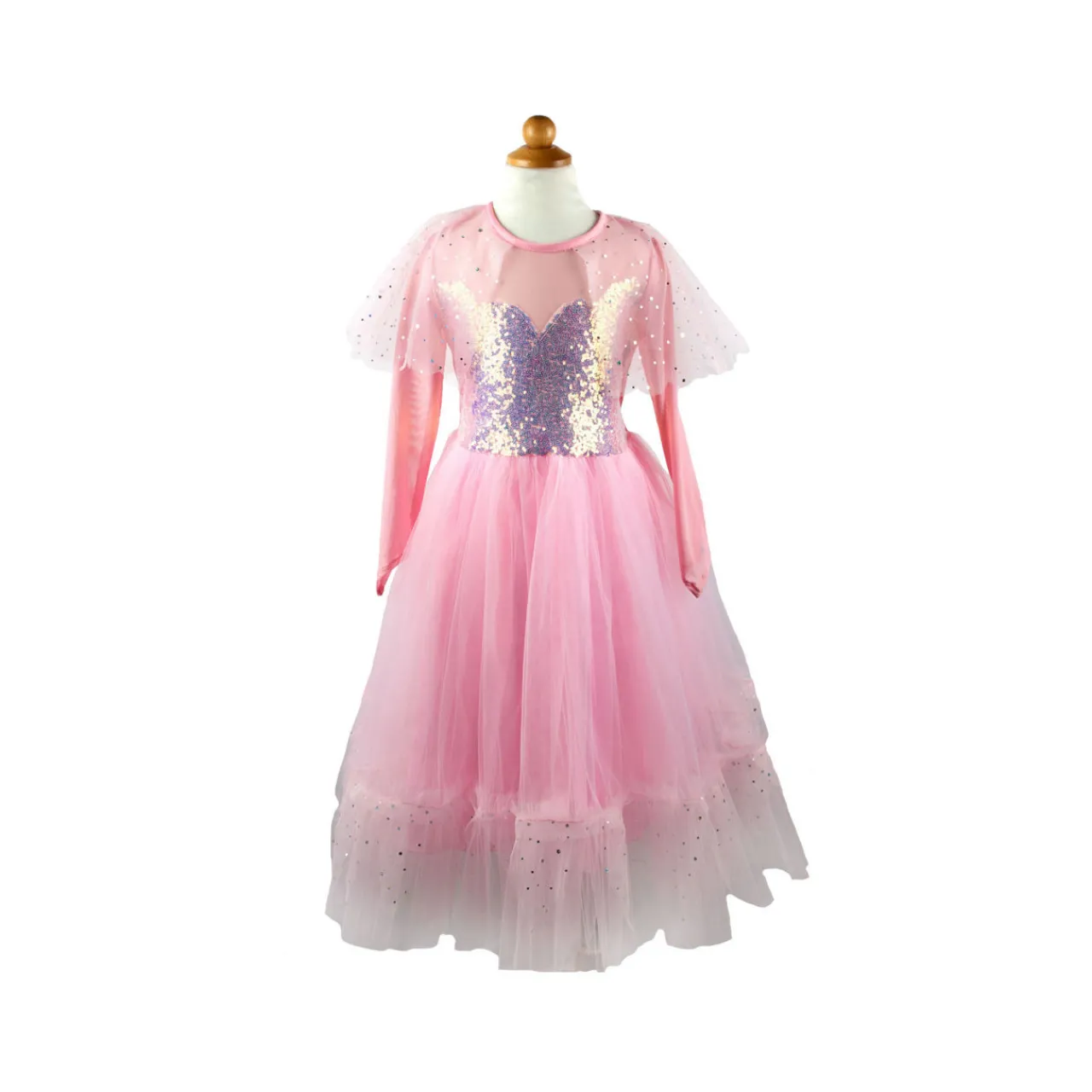- Iridescent sequins on the bodice, sequins illusion neckline, tulle cape, metallic embellishments, lace detailing, full lined skirt
