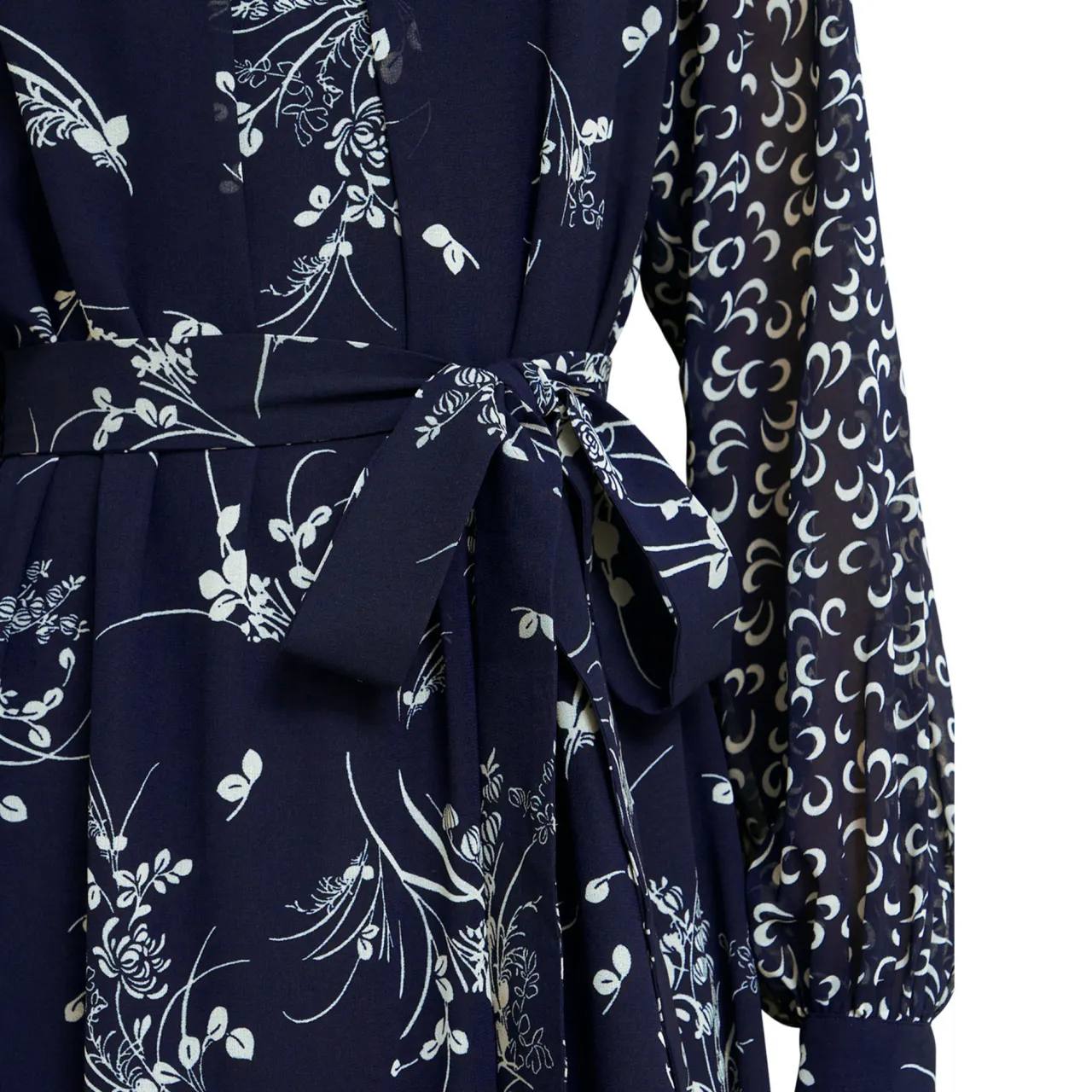 - Contrasting floral and celestial prints, sheer long blouson sleeves, tie-waist, peplum hem, gathered neckline, crew neckline, fit and flare silhouette, zip and hook fastening