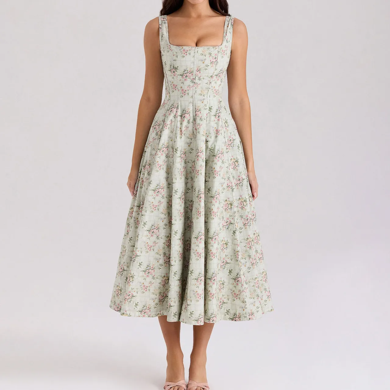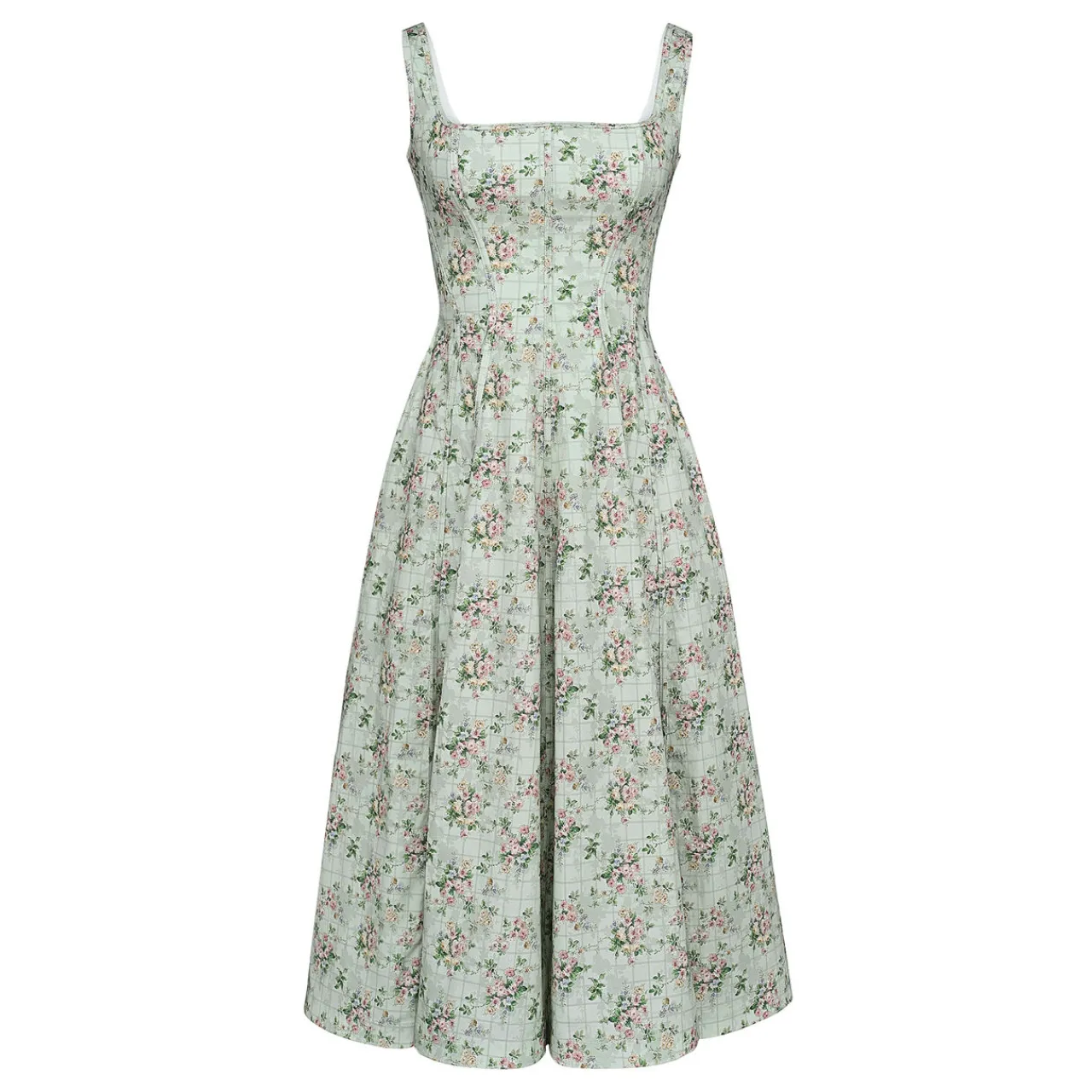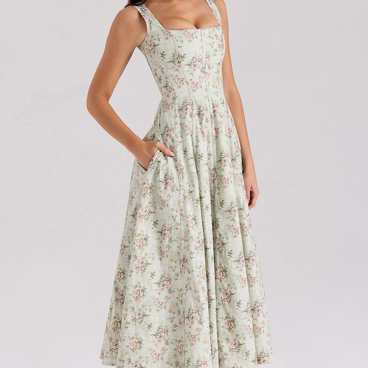 - Floral print, vintage-inspired shape, breathable stretch-fused fabric, square neckline, contrasting seams, boning, side zip fastening