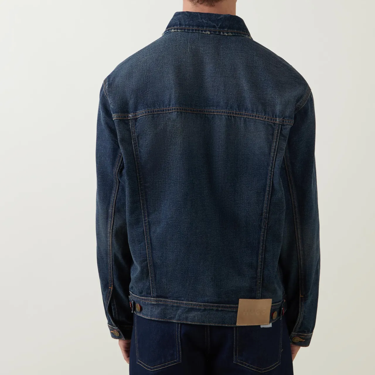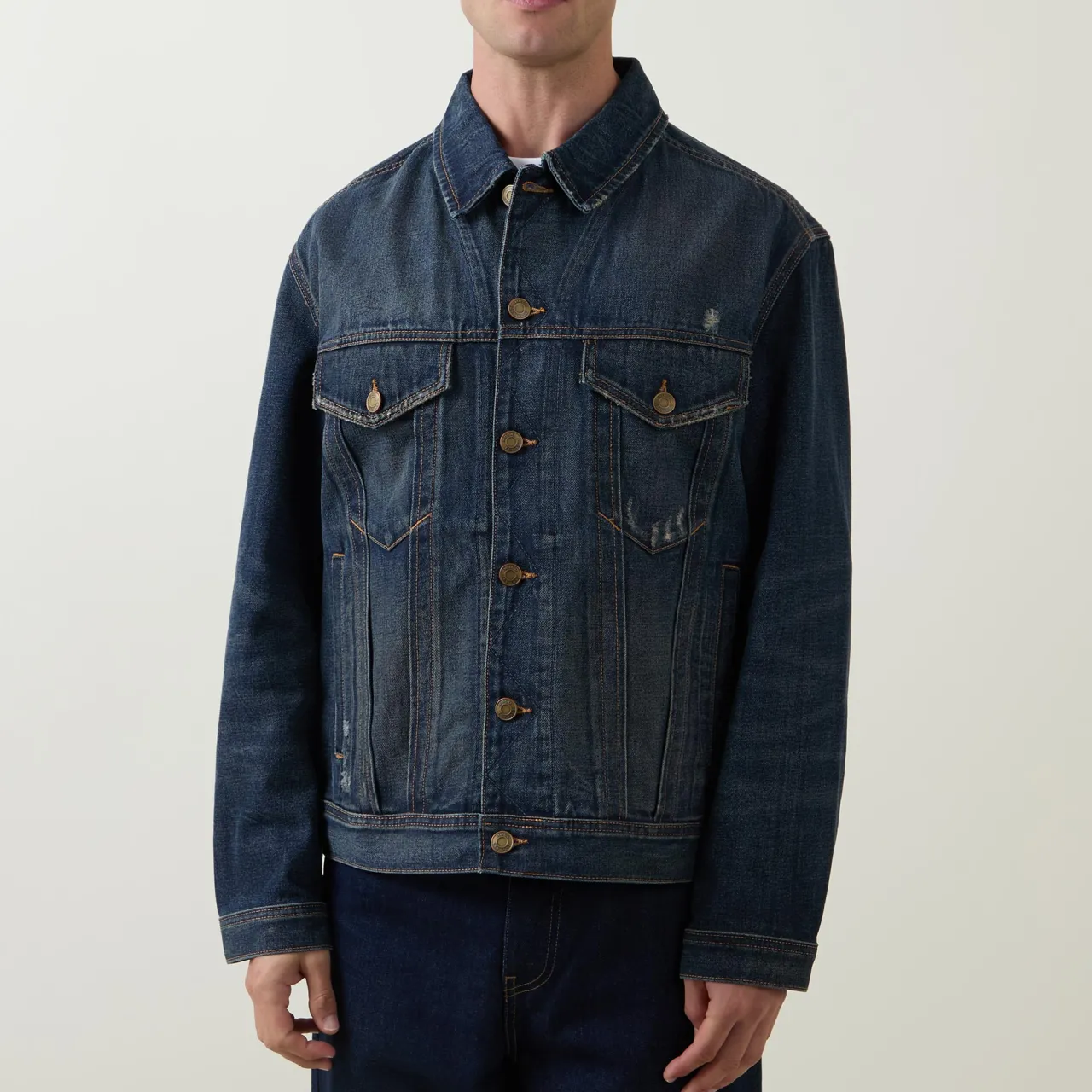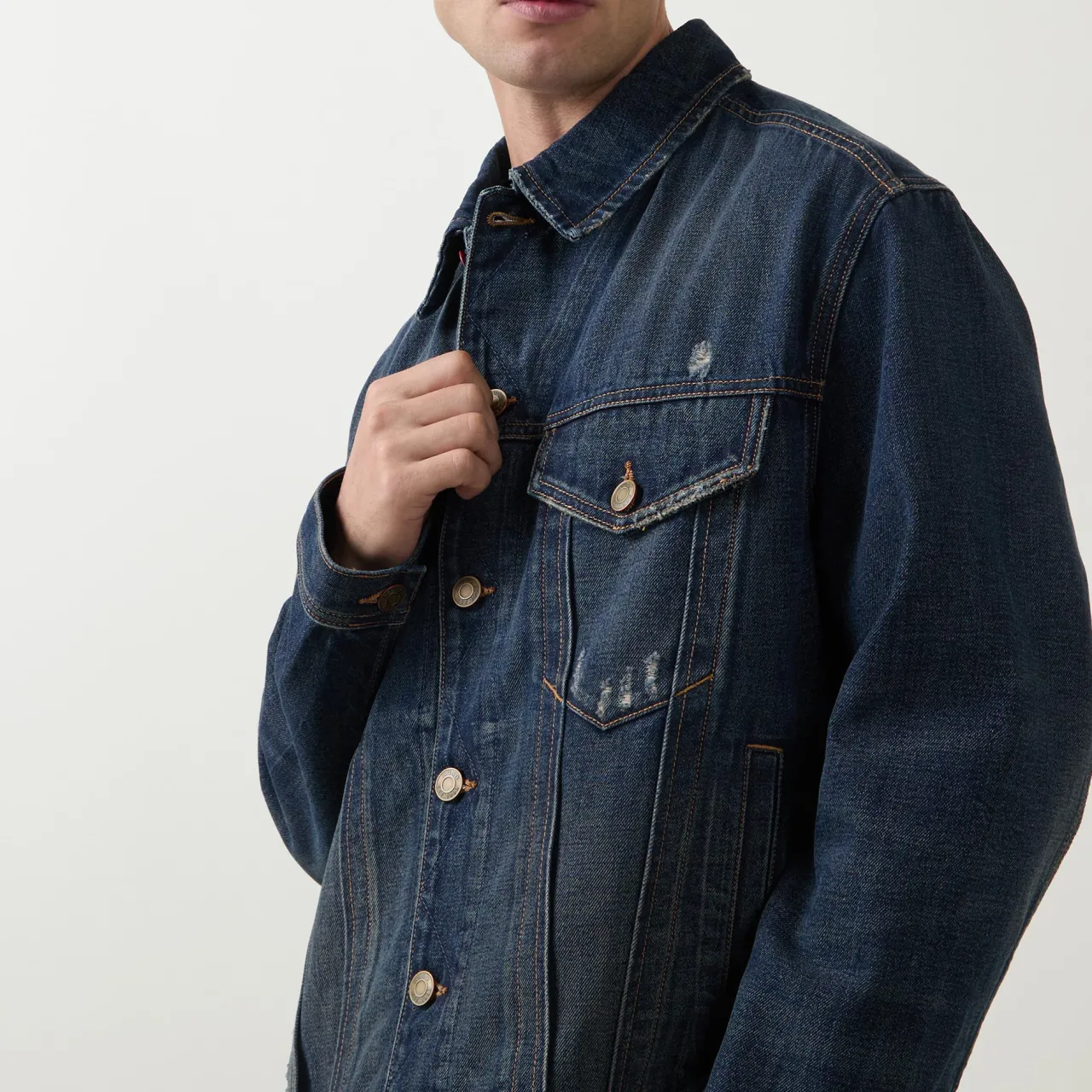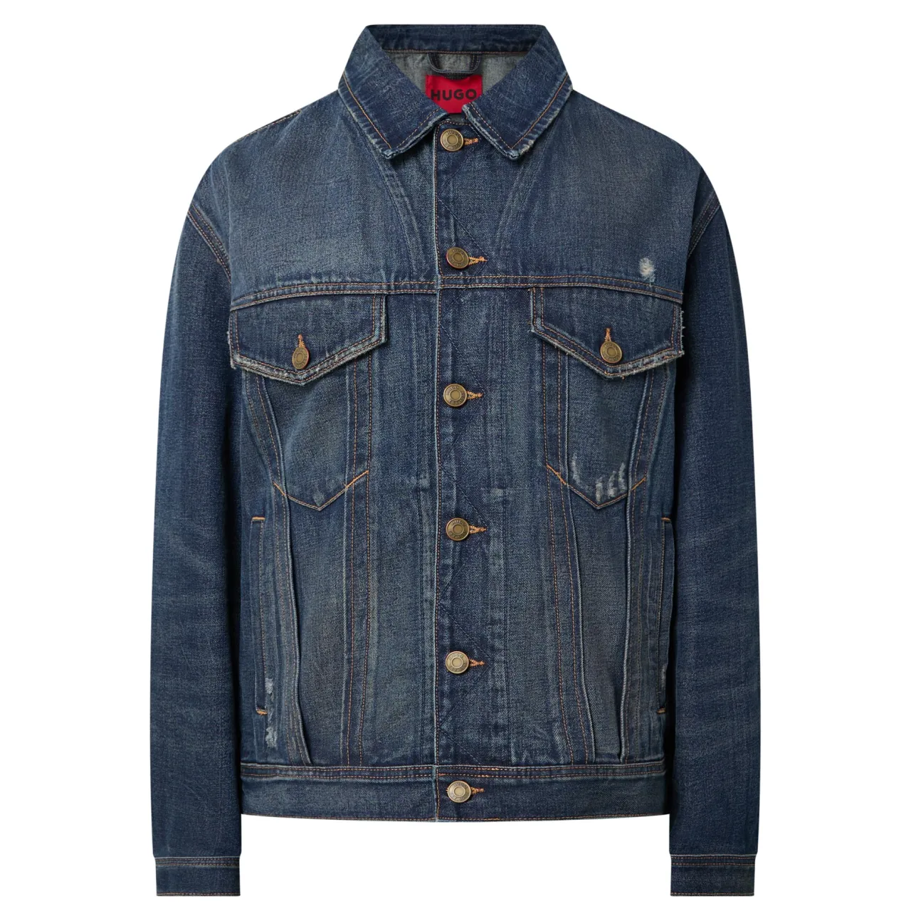 - Classic collar, button fastening, chest pockets, straight hemline, distressed details, dropped shoulders, logo badge