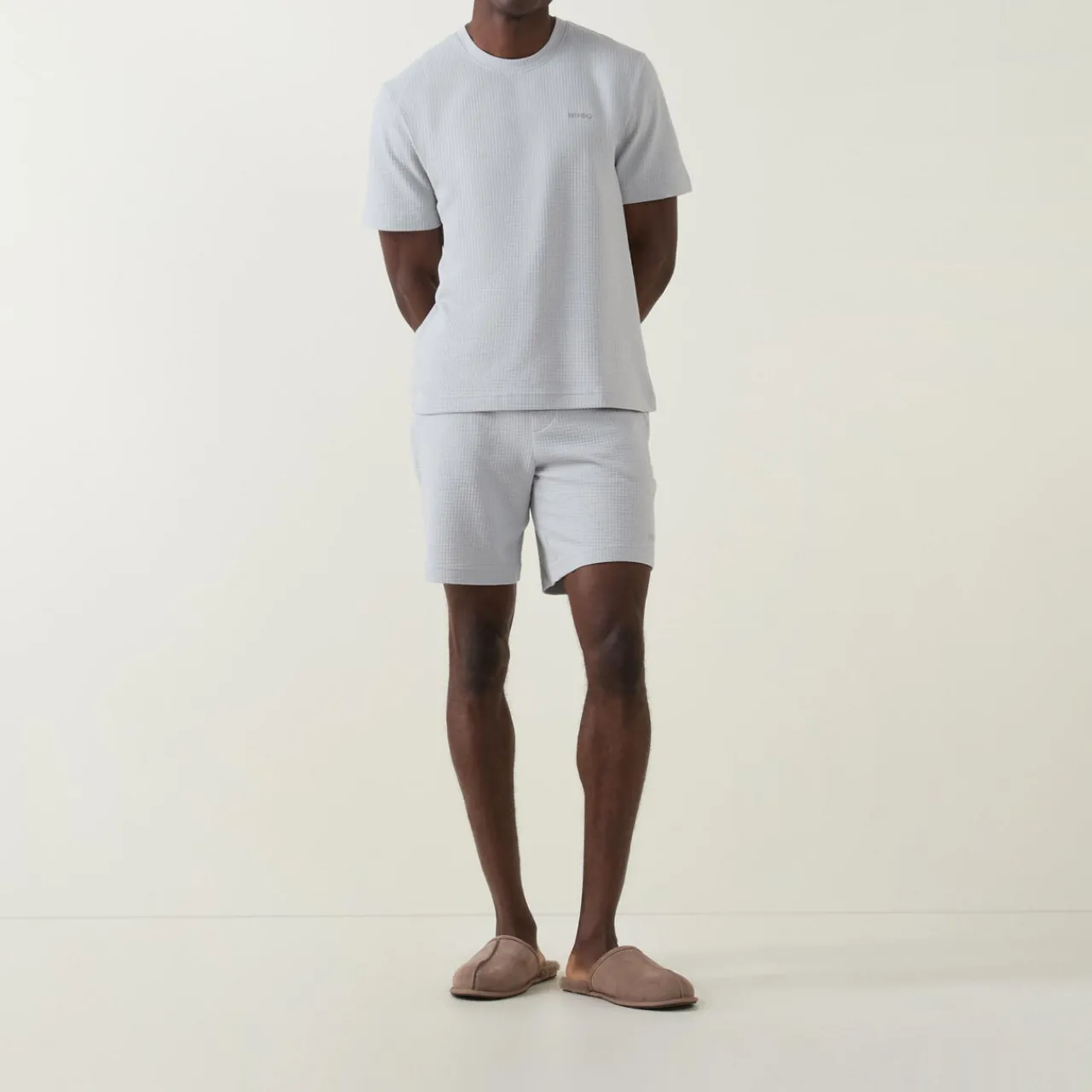 - Waffle finish, drawstring fastenings, elasticated waist, side pockets, logo detail