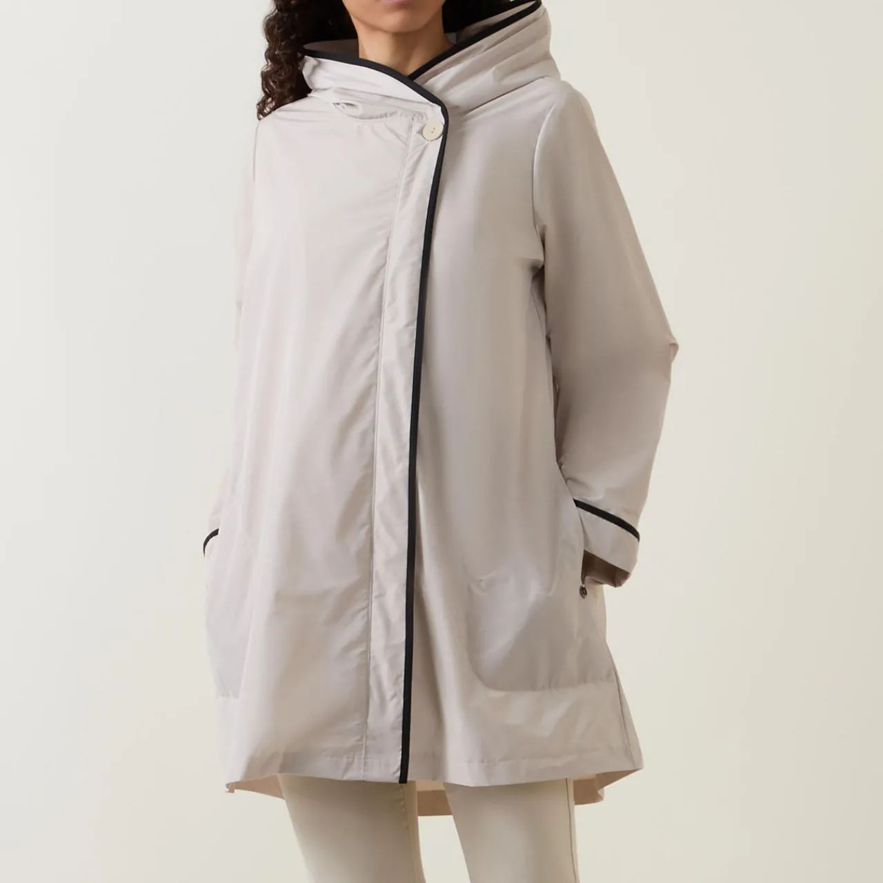 - Hooded, long sleeves, button fastening, contrasting trims, tonal stitching, side slit pockets, padded finish