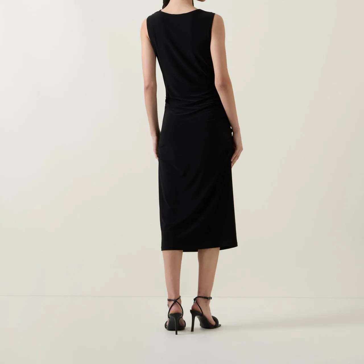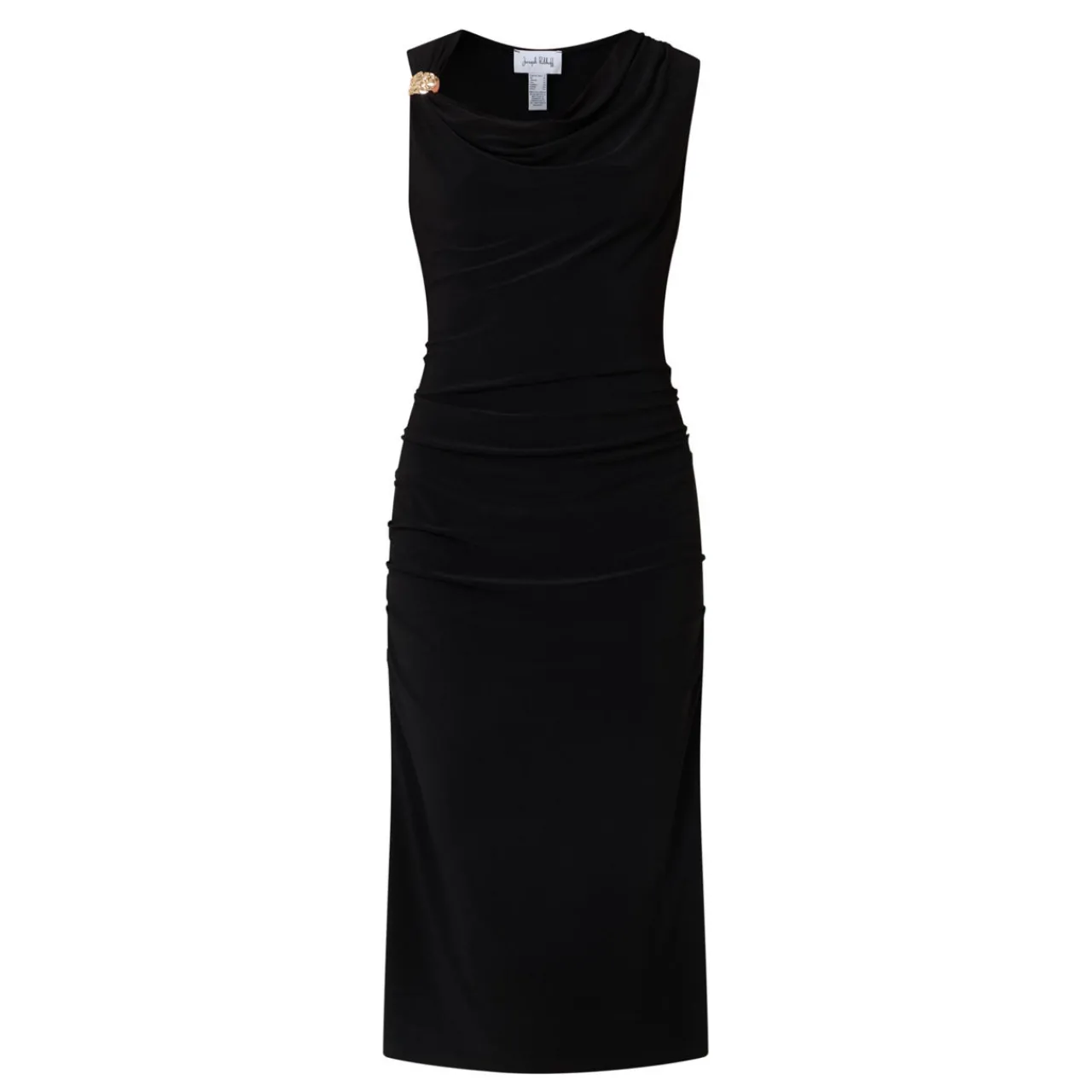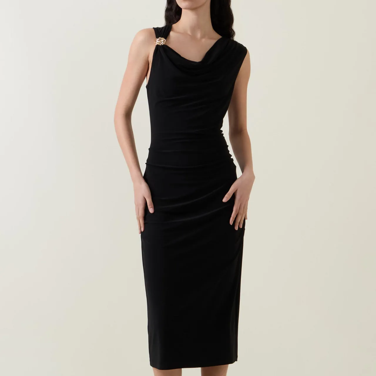 - Asymmetric neckline, midi length, sleeveless, ruched details, gold-tone hardware details