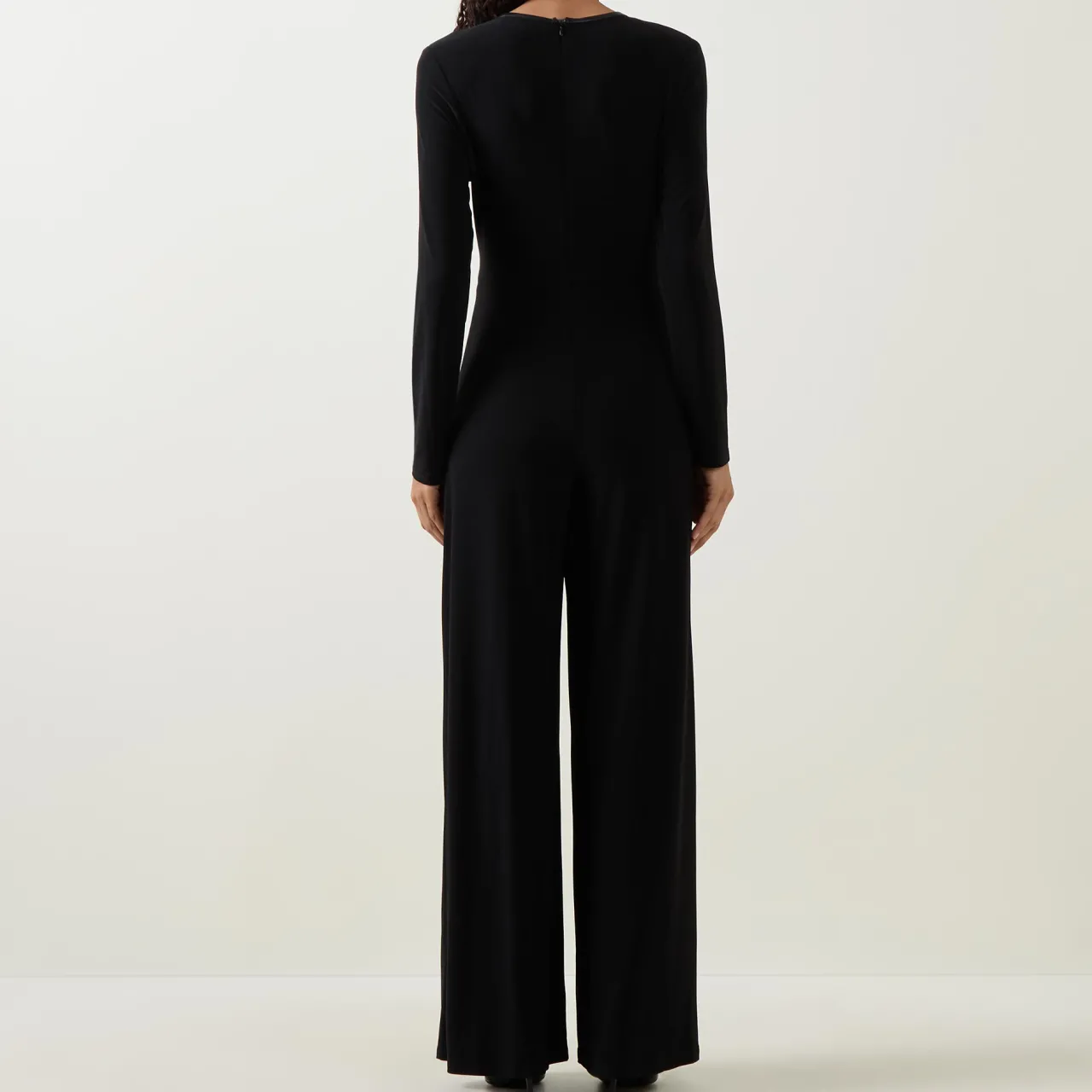 - V-neckline, long sleeves, wrap front, secured by a silver-tone clasp, wide-cut leg, smooth fabric