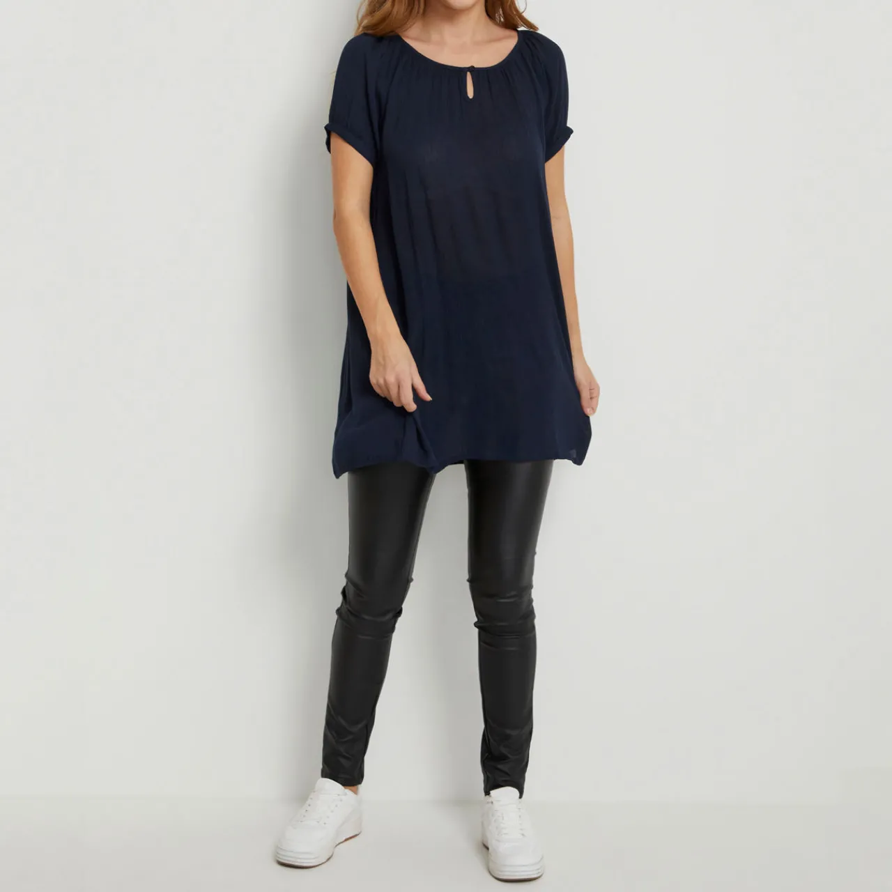- Longline, short sleeves, round keyhole neckline with button fastening, buttoned cuffs