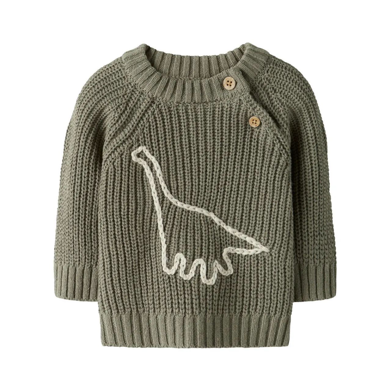 - Crew neckline, long sleeves, button details, dinosaur embroidery, ribbed hemline and cuffs, pullover style, ribbed-knit finish