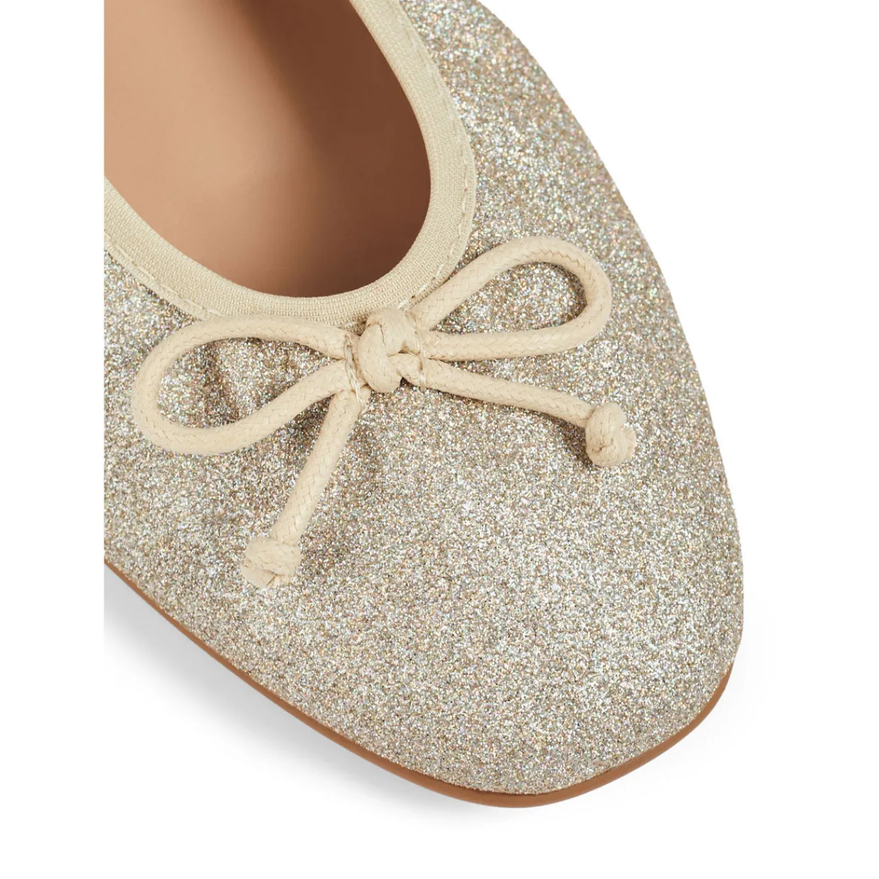 - Round toe, ballerina-style shape, bow detail, glitter finish