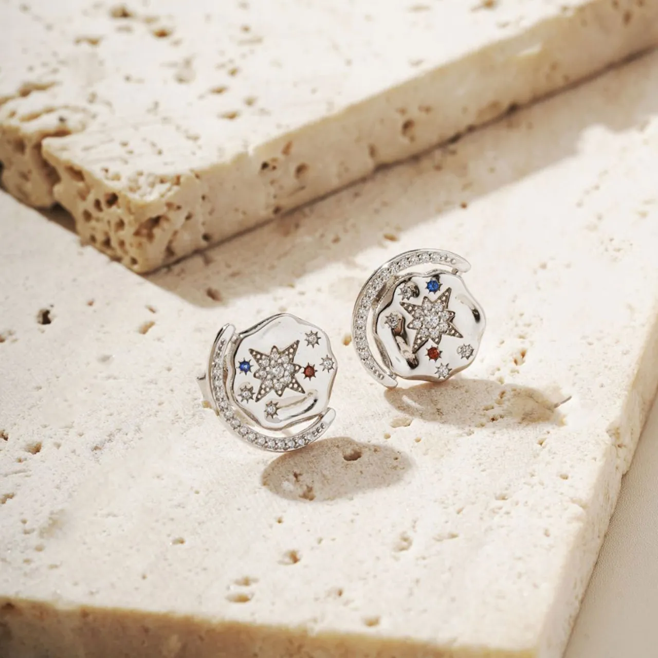- Electrocoating applies a protective layer to jewellery via an electrically charged solution, ensuring durability, corrosion resistance, and consistent colouring, silver-toned hardware, sun, moon and star motifs, stud fastenings