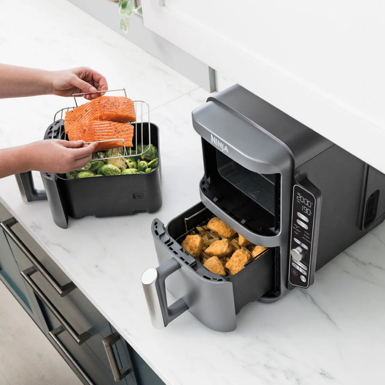 With 2 stacked drawers, thespace-savingNinja Double Stack XL 2-Drawer Air Fryer is 30%slimmer without compromising on capacity– perfect for smaller kitchens, large families and entertaining.