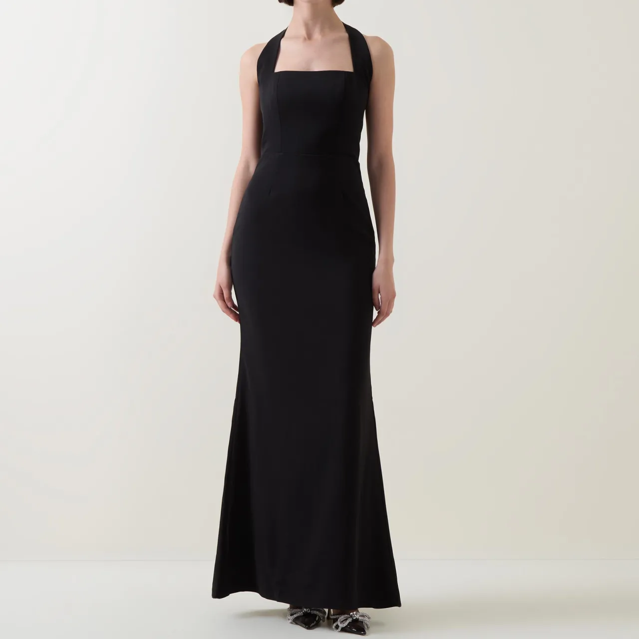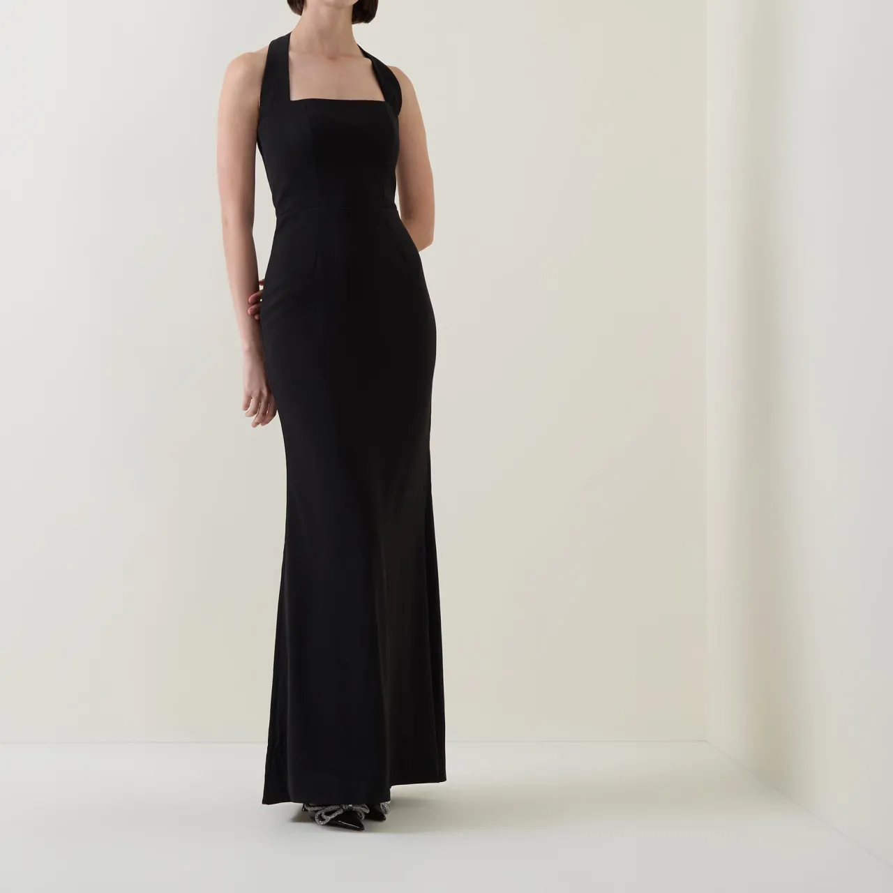 - Square neckline, halter tie fastenings, back zip fastening, darts, cinched waist, flared hem