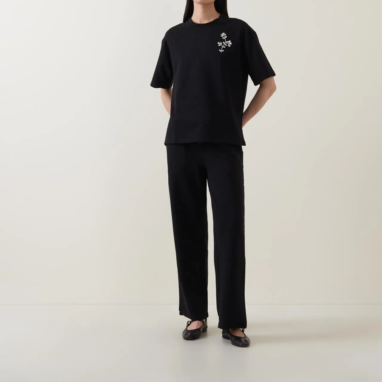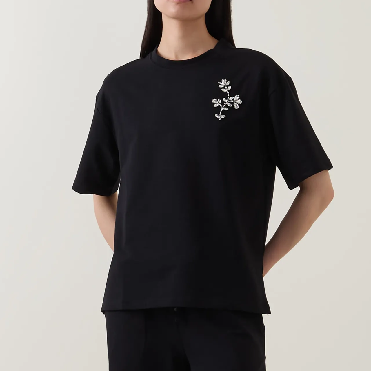 - Floral embellishment, short sleeves, crew neckline, straight hemline