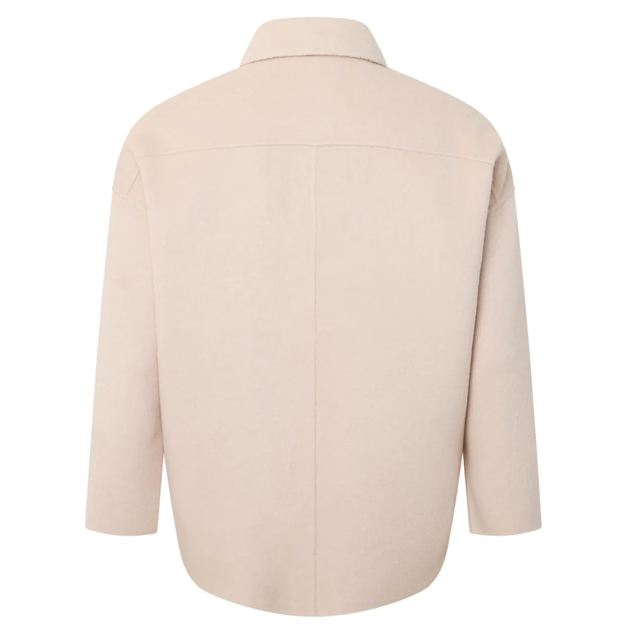 - Shirt collar, long sleeves, front button fastening, two welt pockets, curved high low hemline, double-faced fabric, soft finish