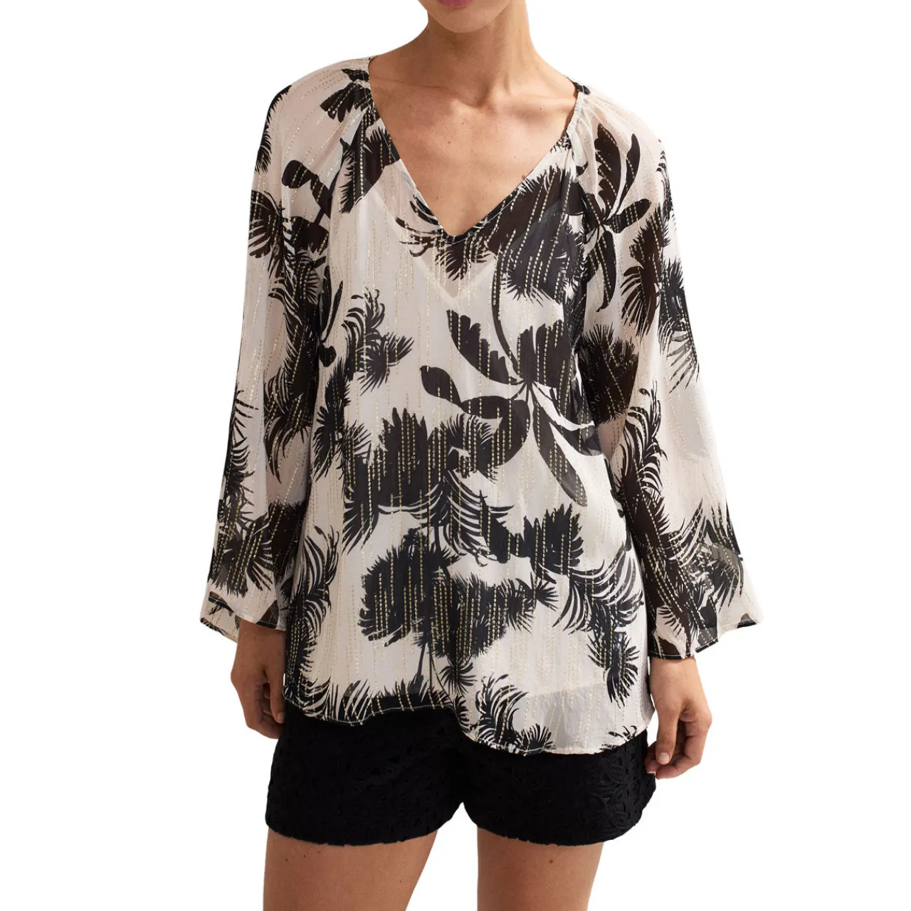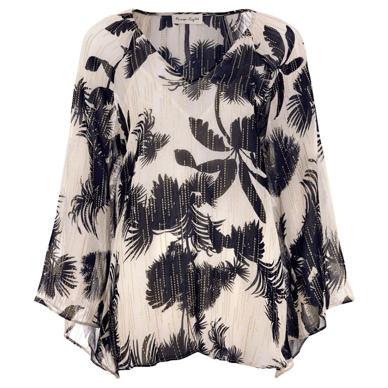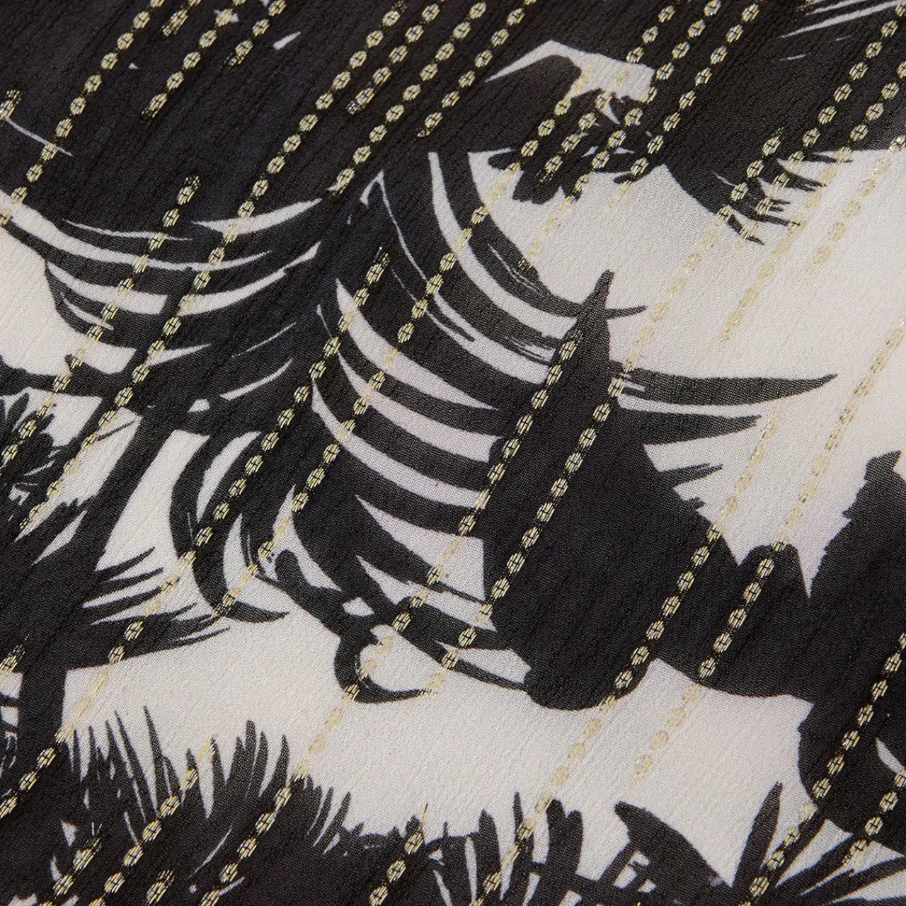 - Tropical palm print, shimmering gold-tone detailing, lightweight, long angled sleeves, no fastening