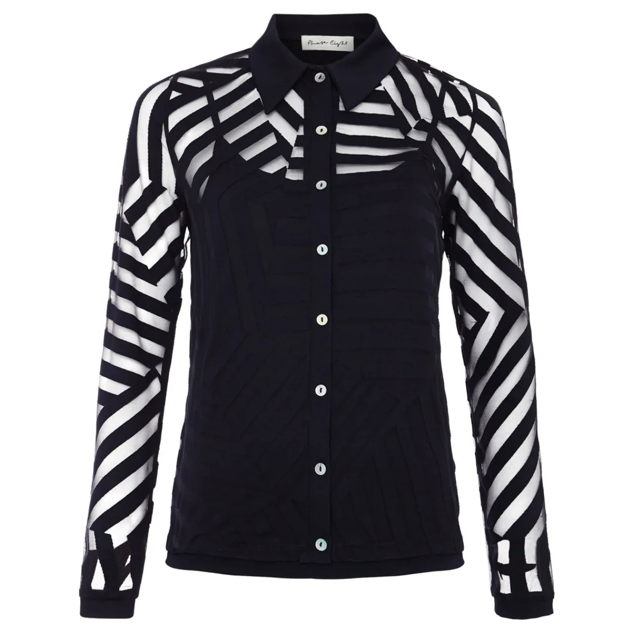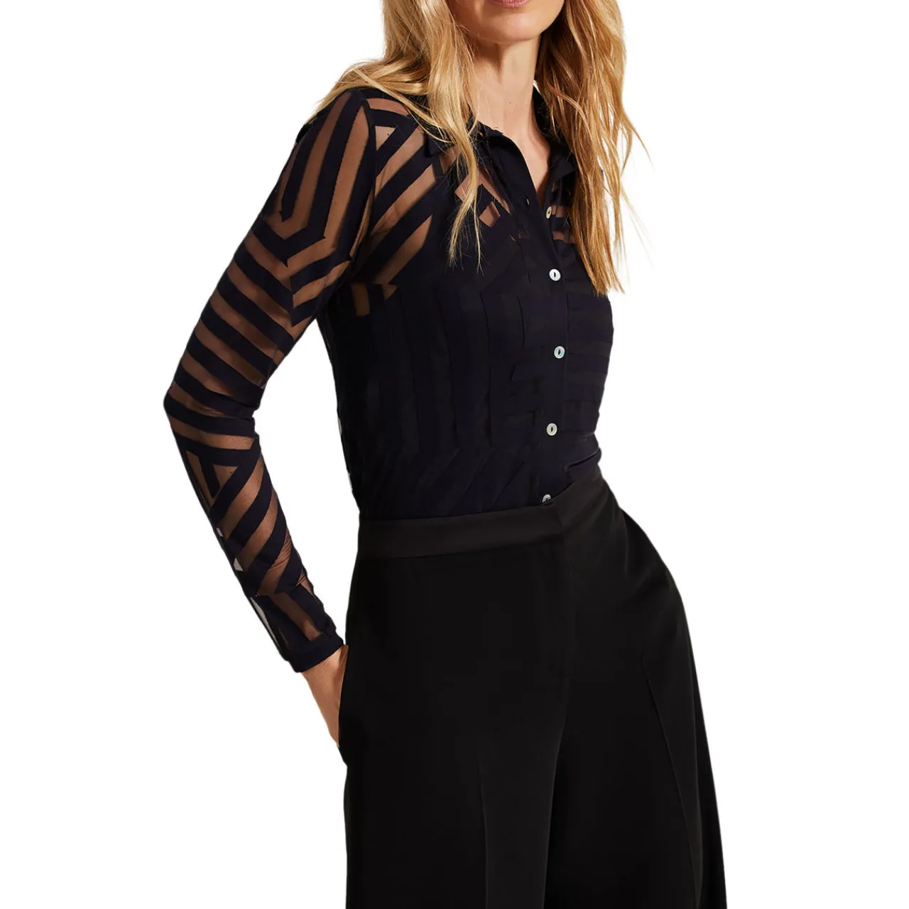 - Collared neckline, button fastening, sheer upper with striped pattern, long sleeves, straight hemline, cami-style base layer