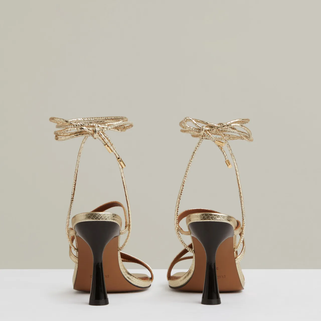 - Metallic leather, snakeskin effect, cord wrap, tie-ankle straps, tapered heel, squared open toe
