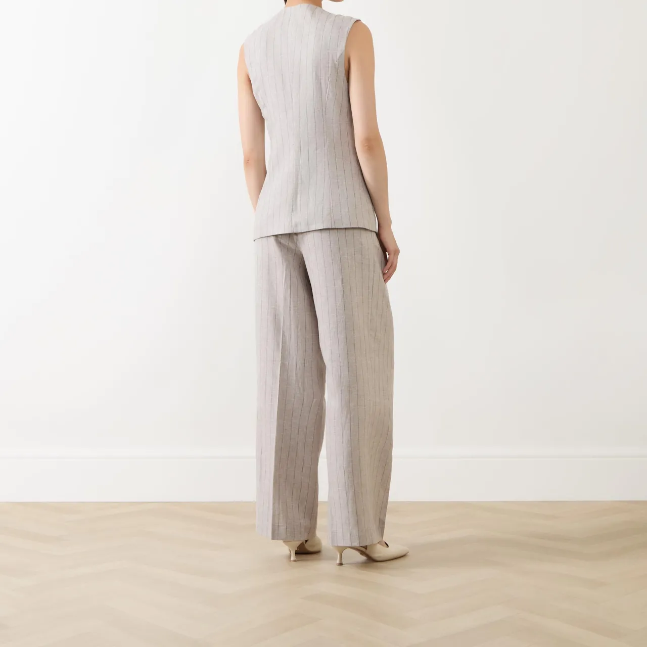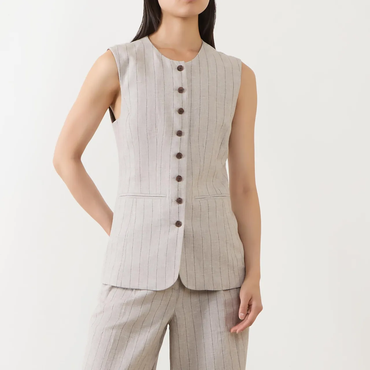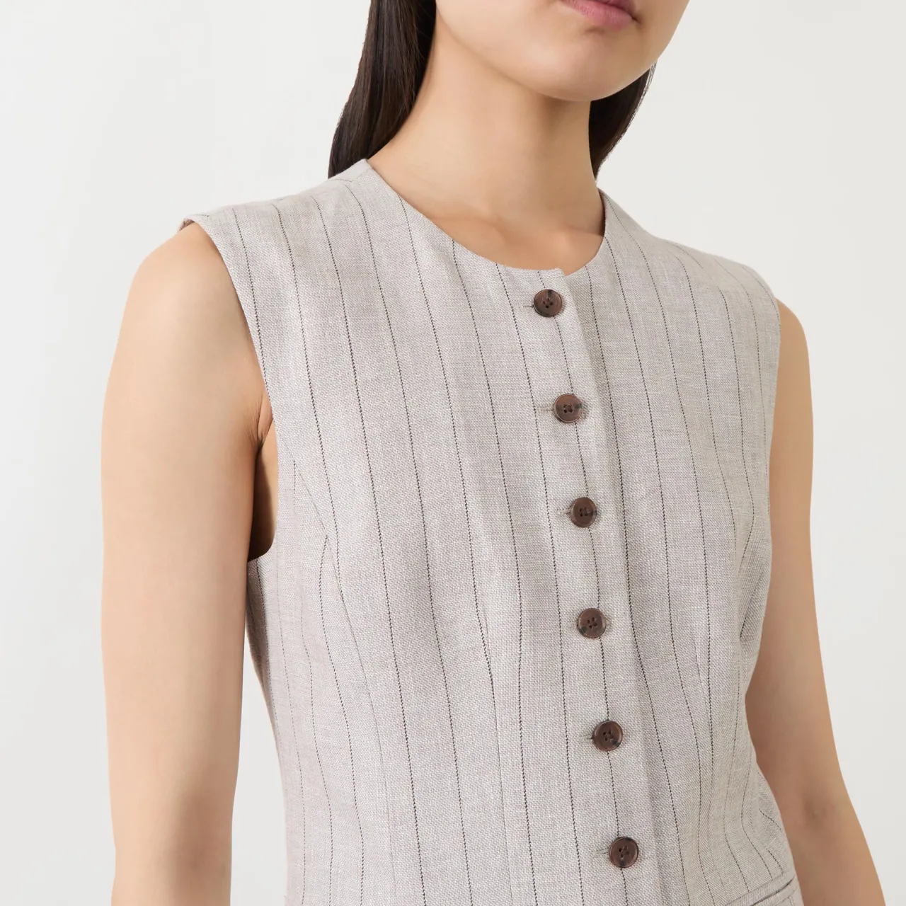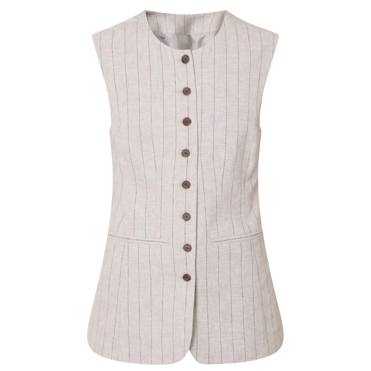 - Round neckline, sleeveless design, front button fastening, dart detailing, two front welt pockets, curved front hem, pinstripe pattern