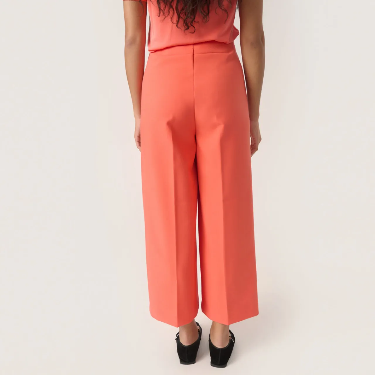 - Flat front, hook and eye with fly zipper fastening, pressed creases, wide-cut legs