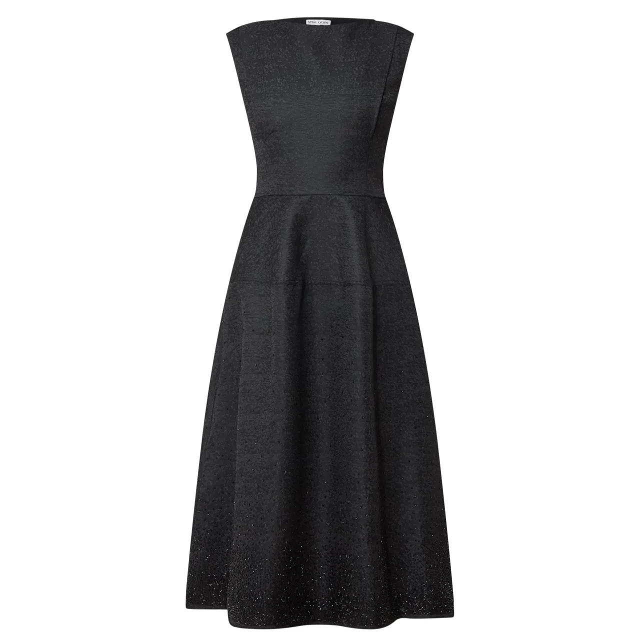 - Boat neckline, sleeveless design, side zip fastening, fitted through the waist, full flared skirt, side seam pockets, flared hem, jacquard finish with tonal bead embellishments, midi length