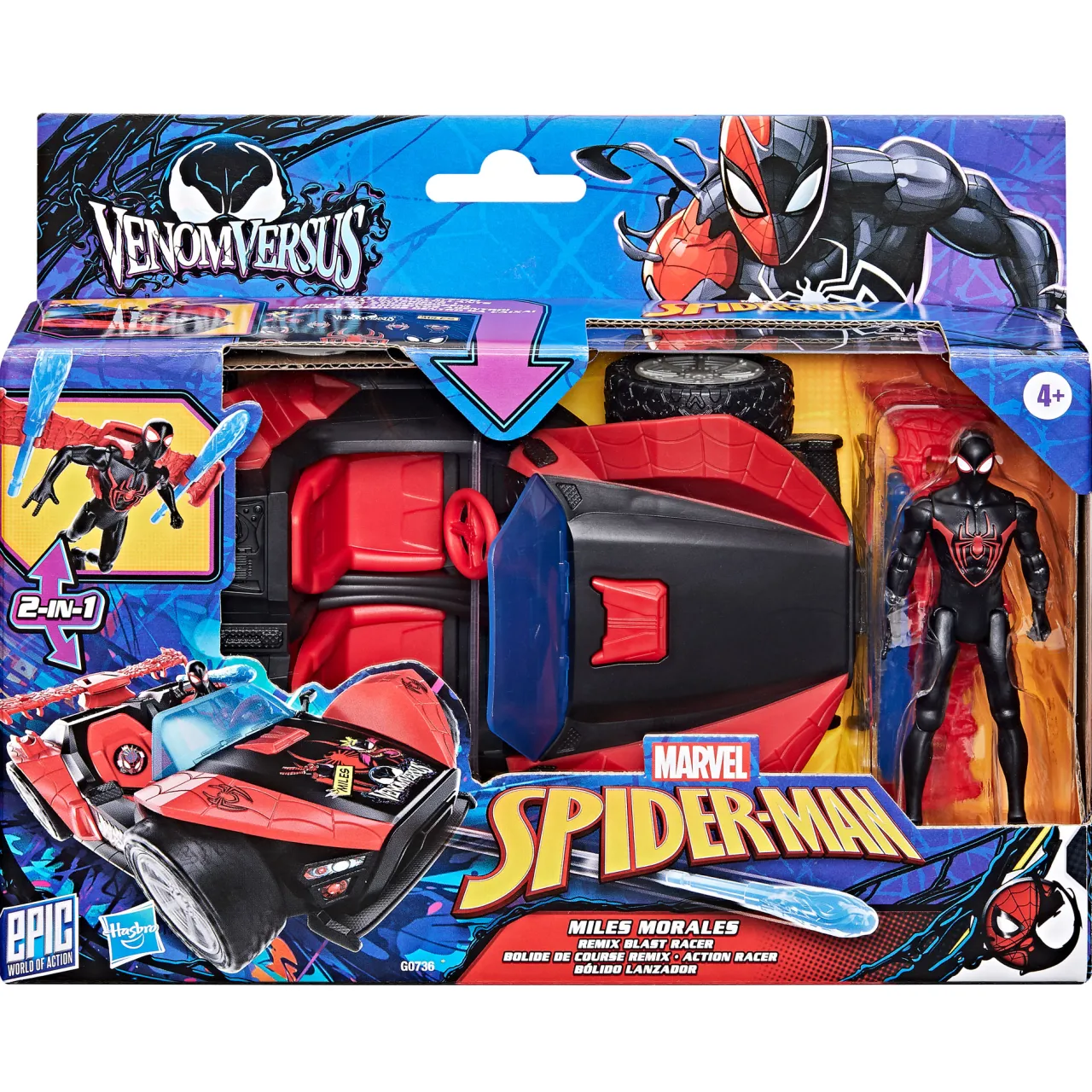 - Miles Morales figure, vehicle toys, poseable limbs, 3 web projectile accessories, sticker sheet