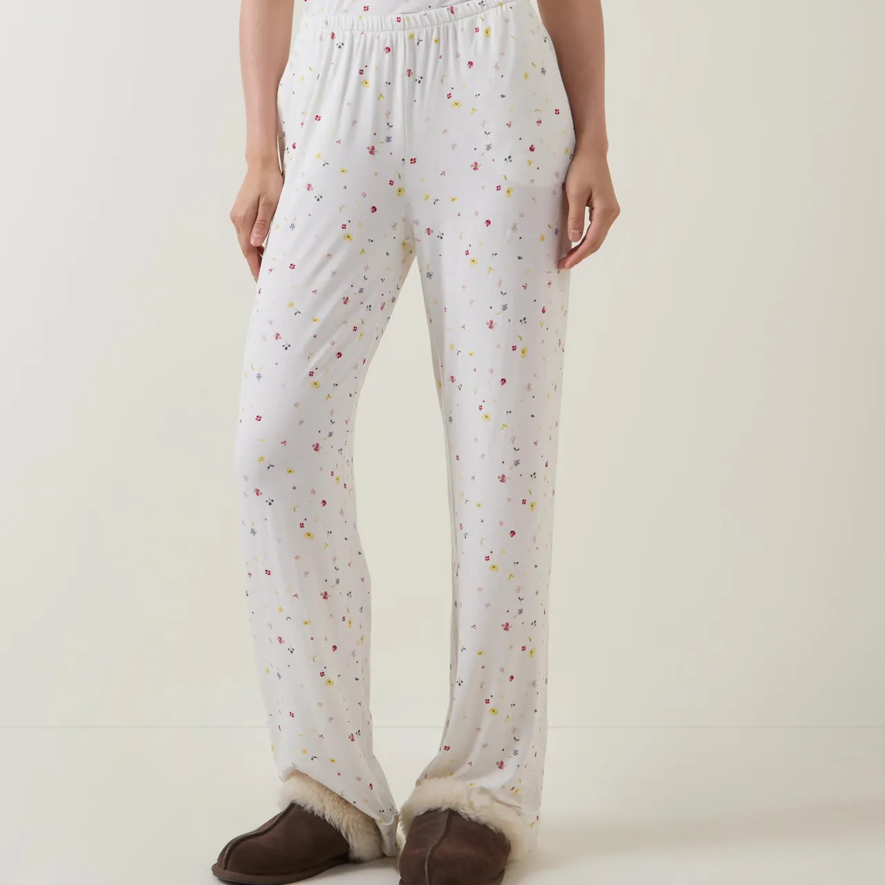 - Mid-rise, straight leg, full length, elasticated waistband, two side seam pockets, clean hems, ditsy print pattern, soft finish