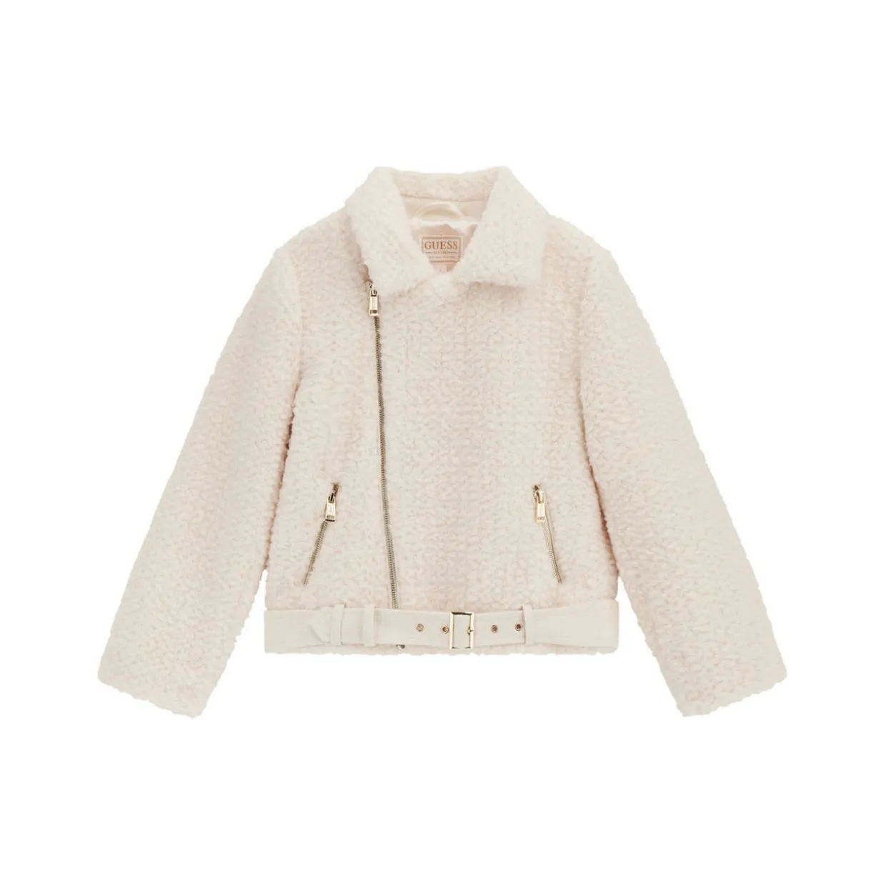 - Long sleeves, faux-fur finish, belt detail, asymmetric zip fastening, zipped pockets, collar, logo detail
