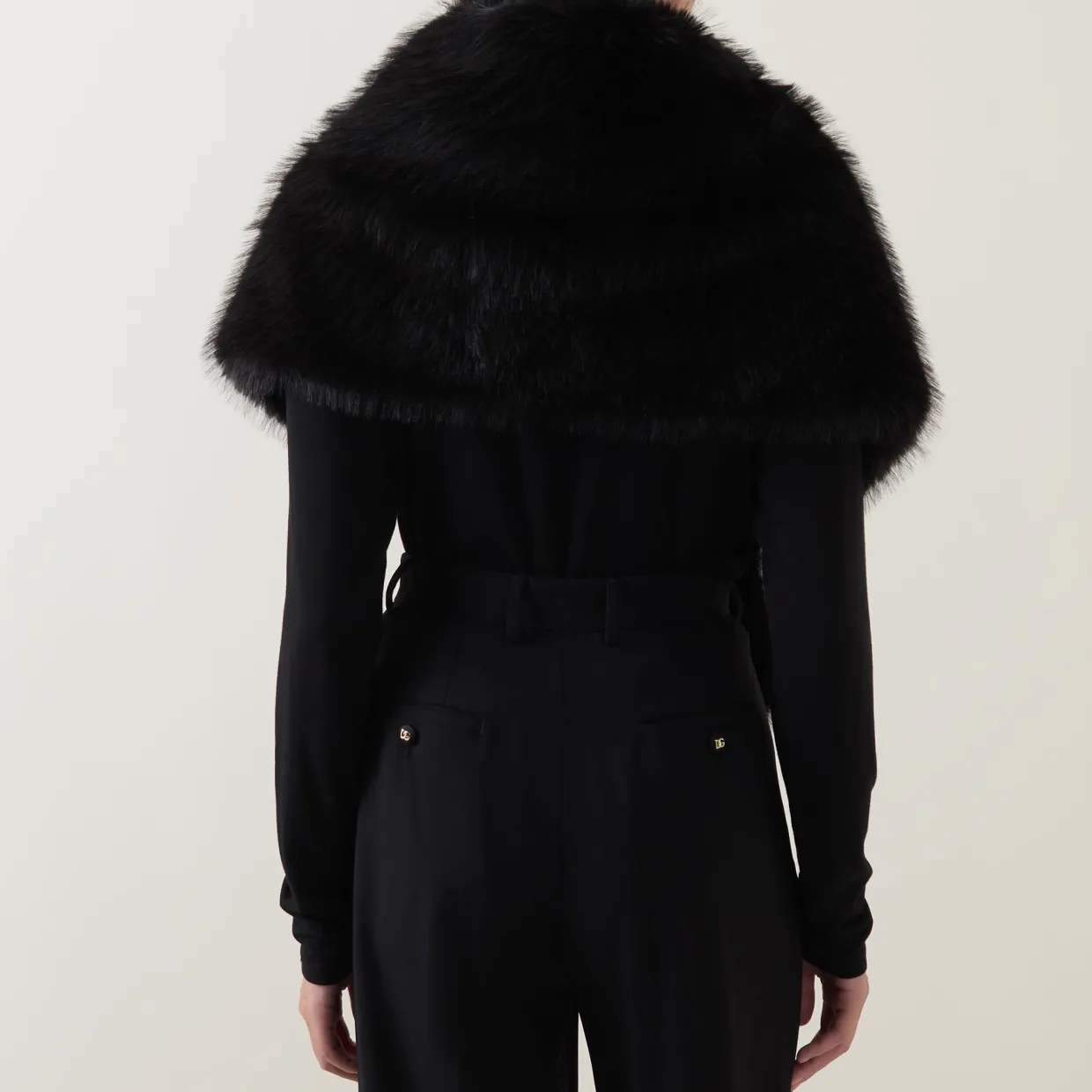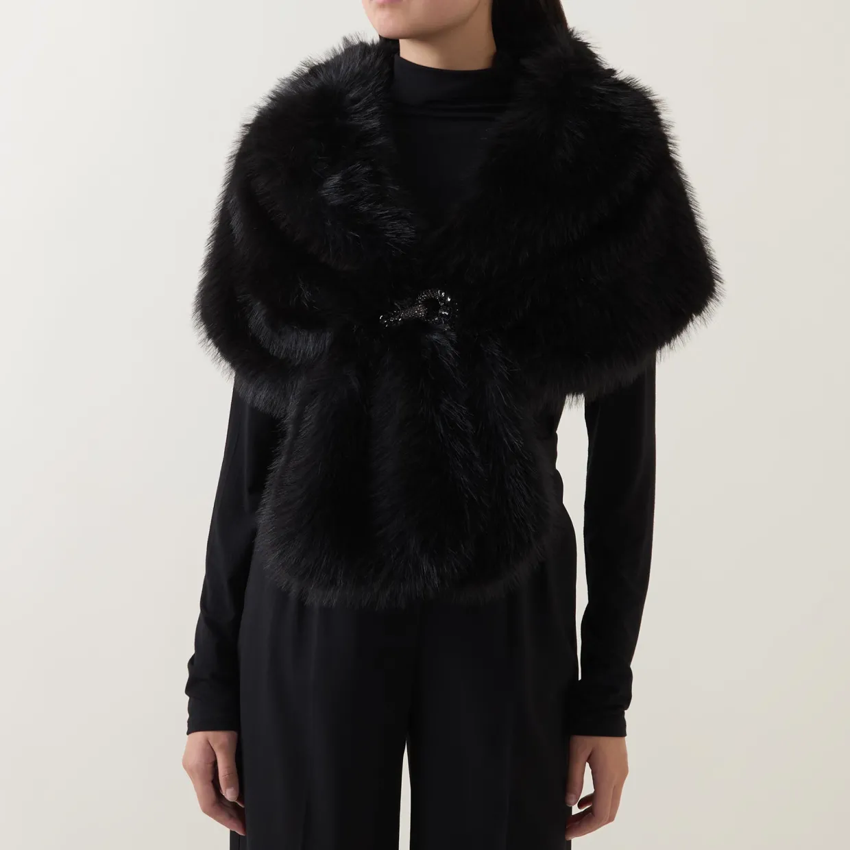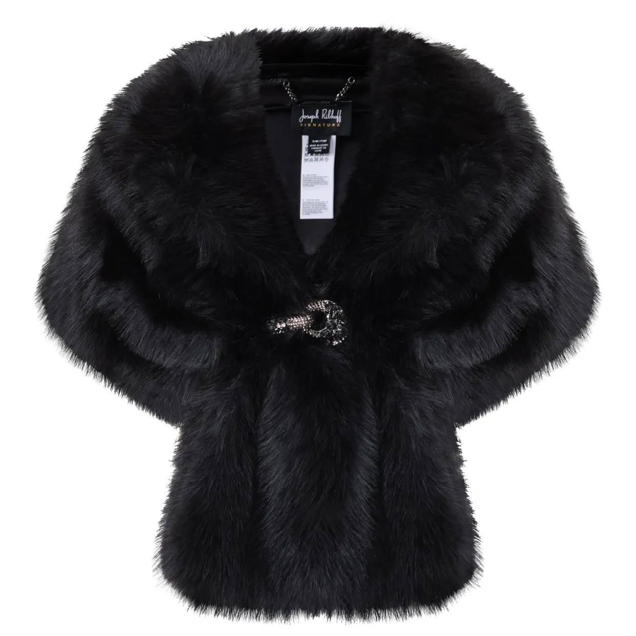 - Shawl collar, single button fastening, embellished detailing, faux fur finish
