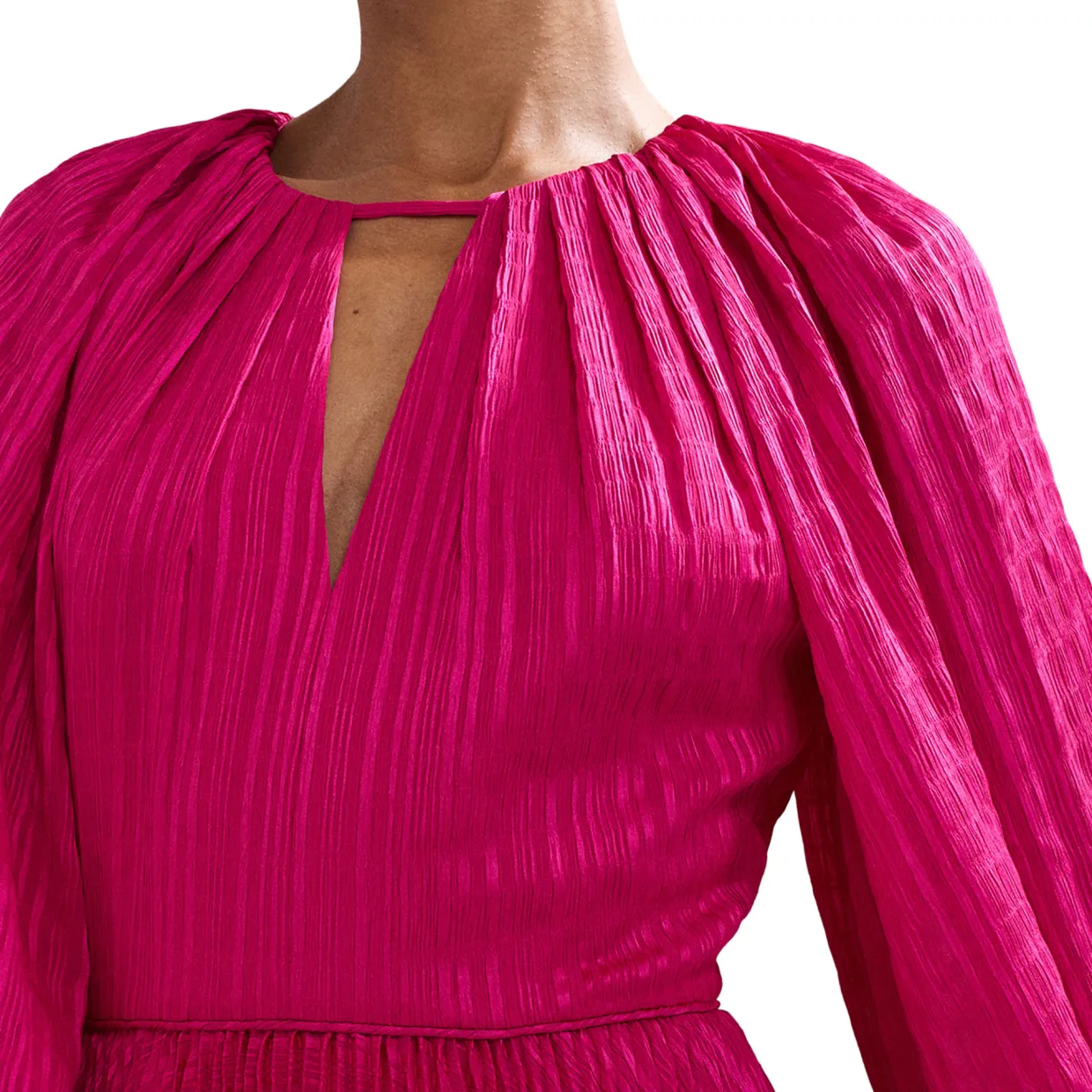 - Tactile plisse fabric, midi length, long balloon sleeves, concealed zip fastening