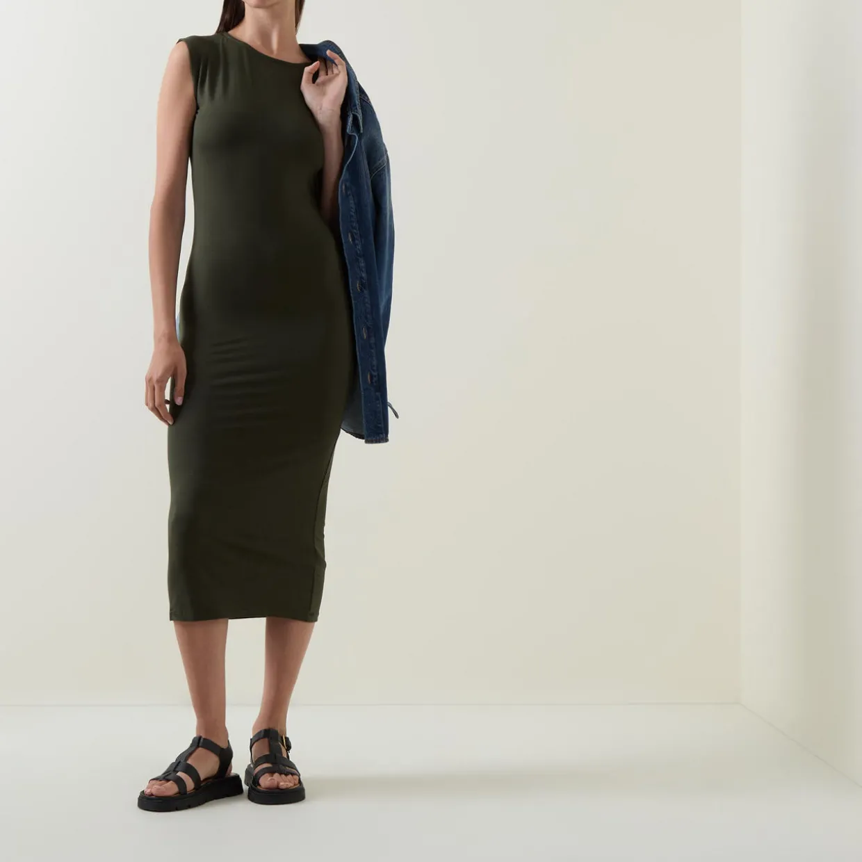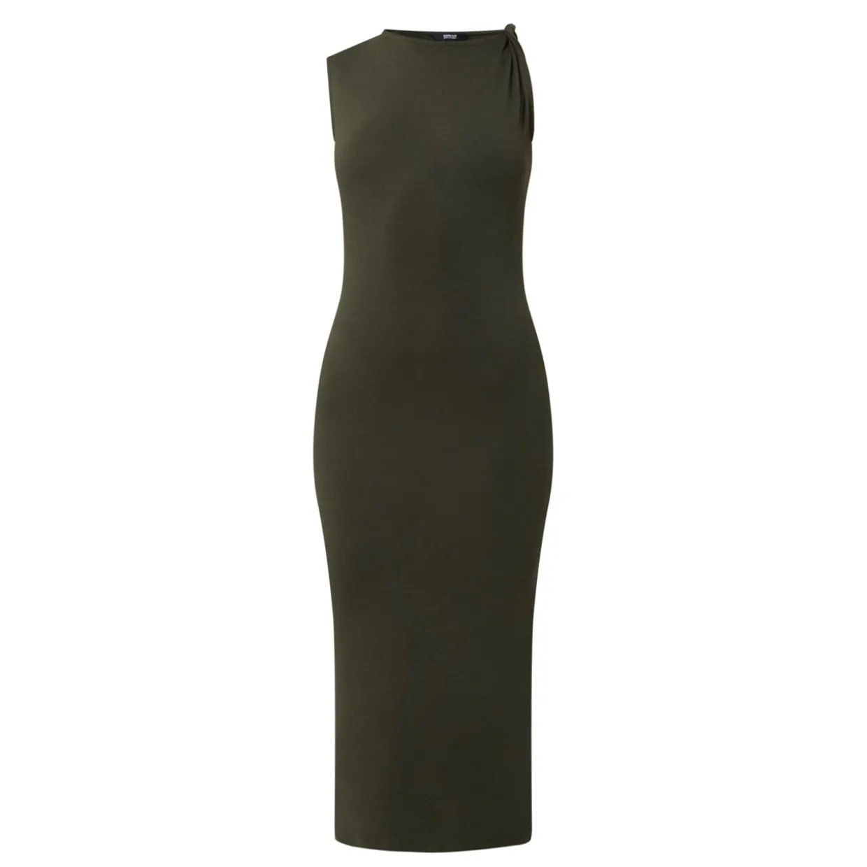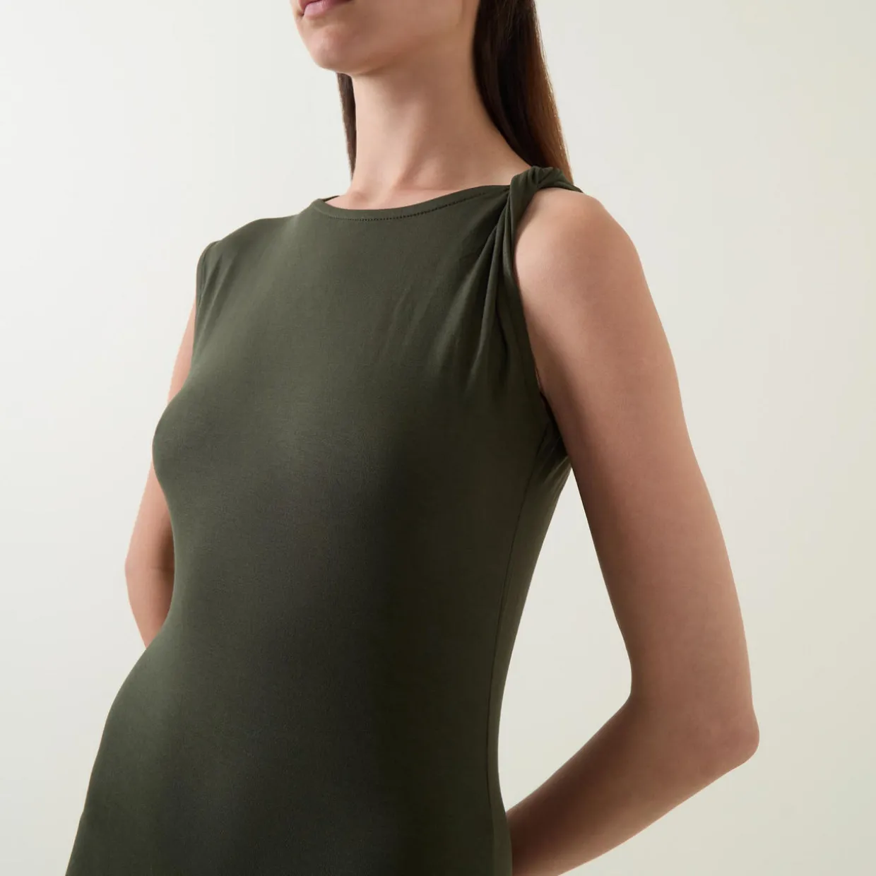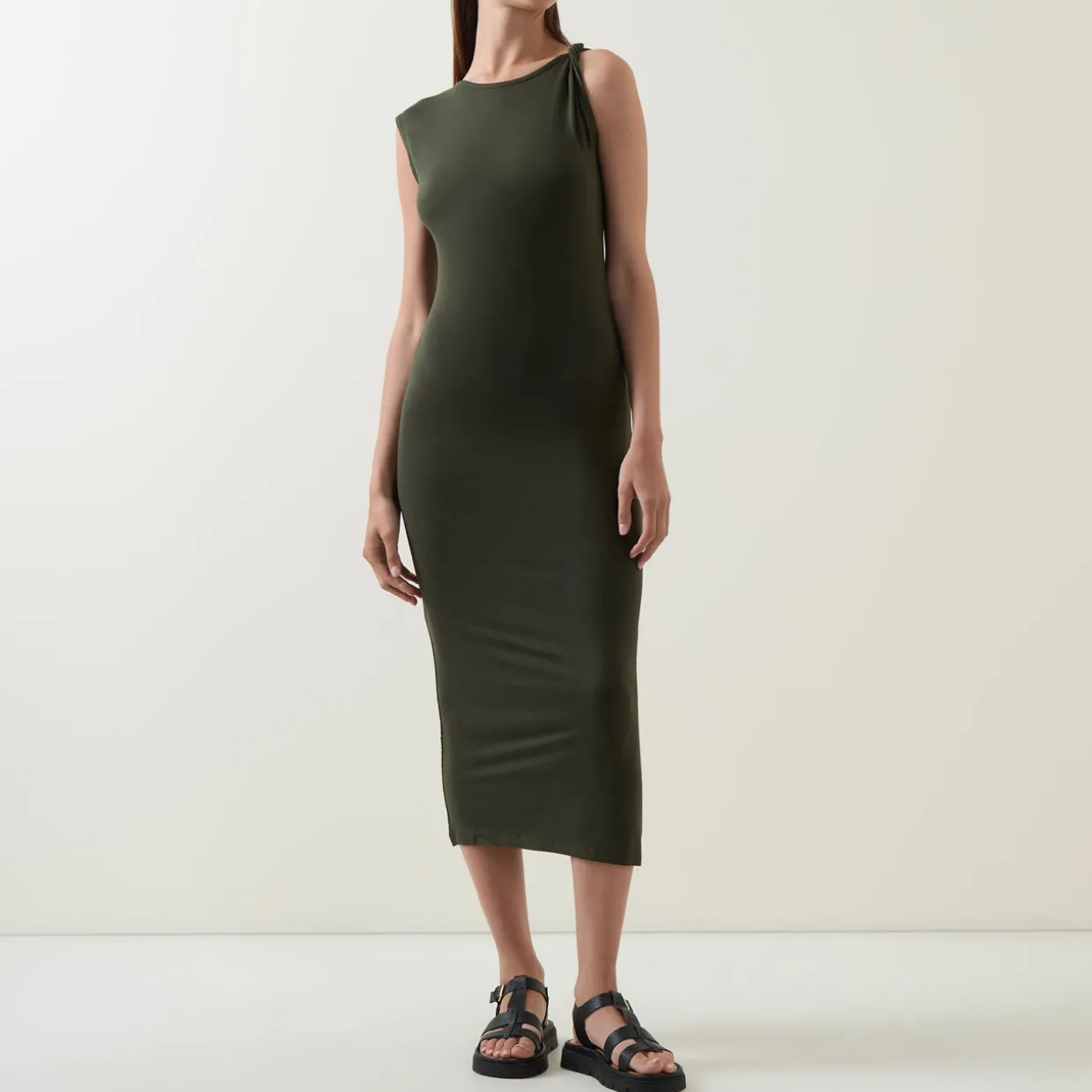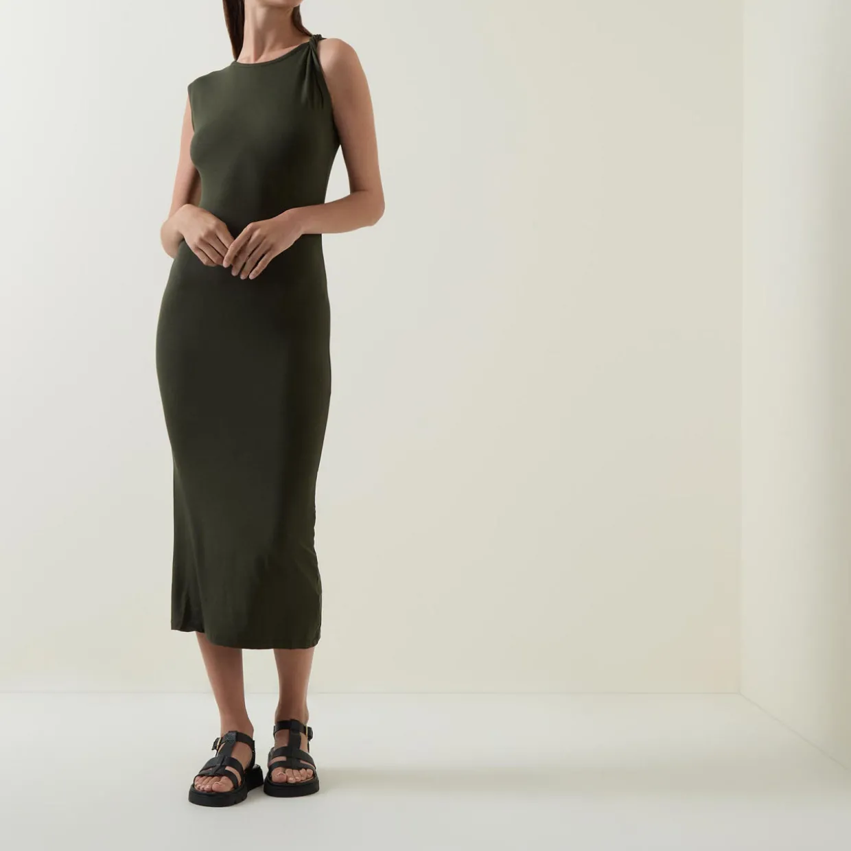 - Sleeveless, round neckline, twisted strap detail, rear logo detail, fitted silhouette, midi length