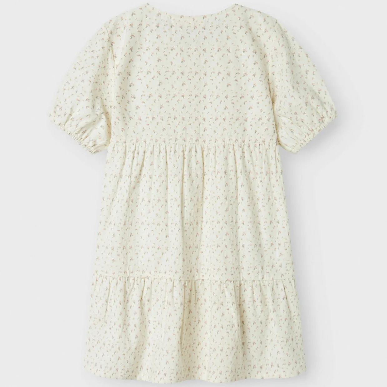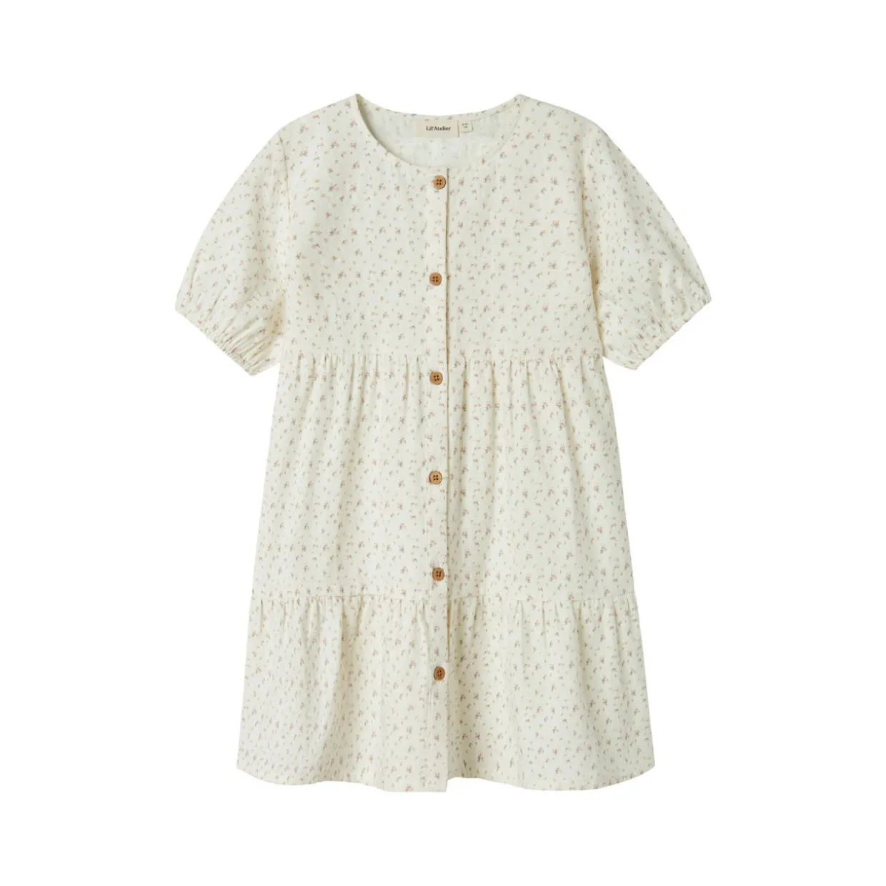 - Short sleeves, round neckline, button fastening placket, elasticated cuffs, floral pattern, tiered flared silhouette, smooth fabric