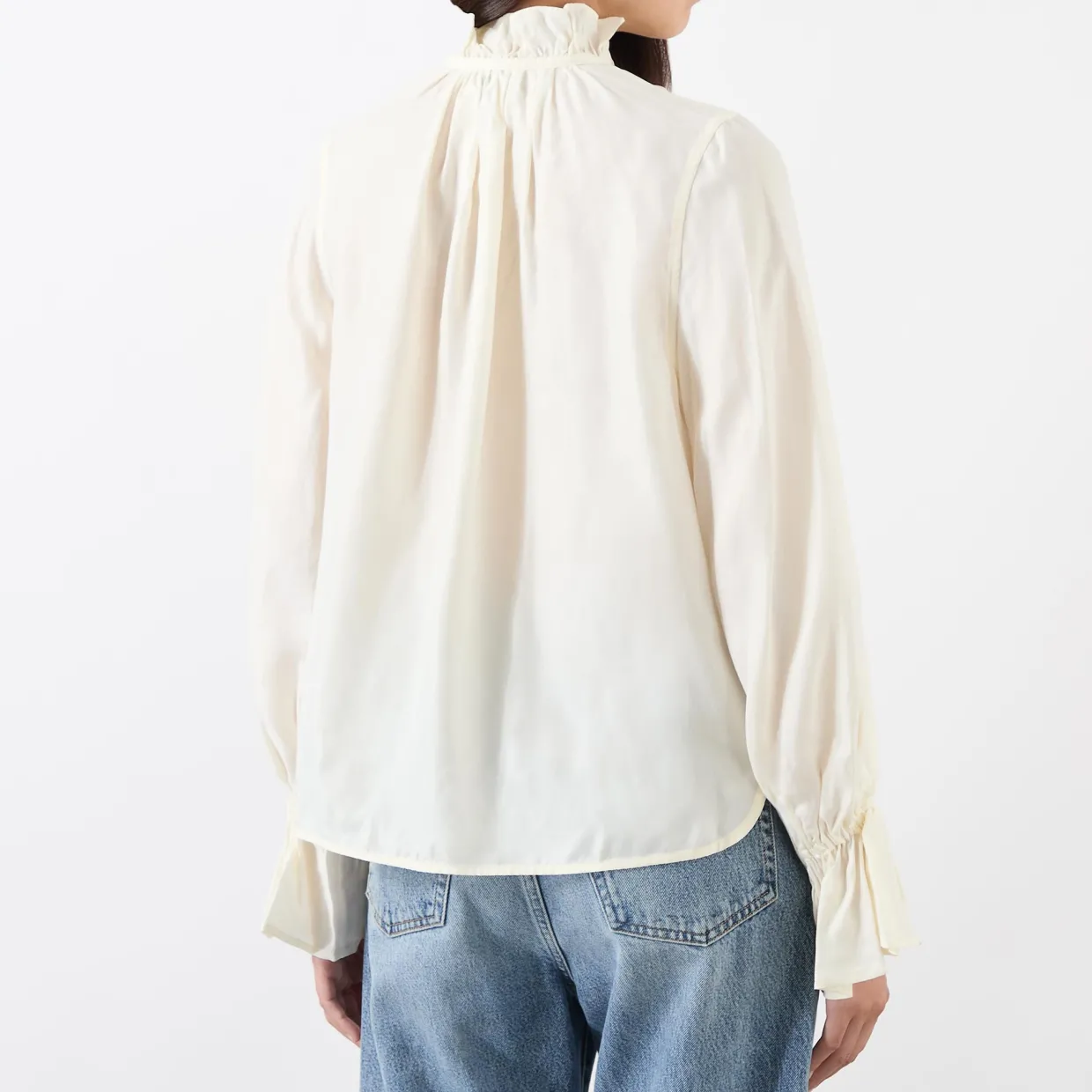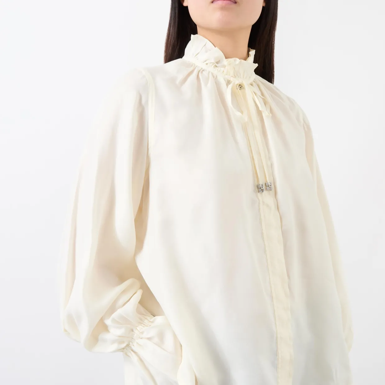- High neckline, self-tying neckline, ruffled cuff, logo detail, straight hemline