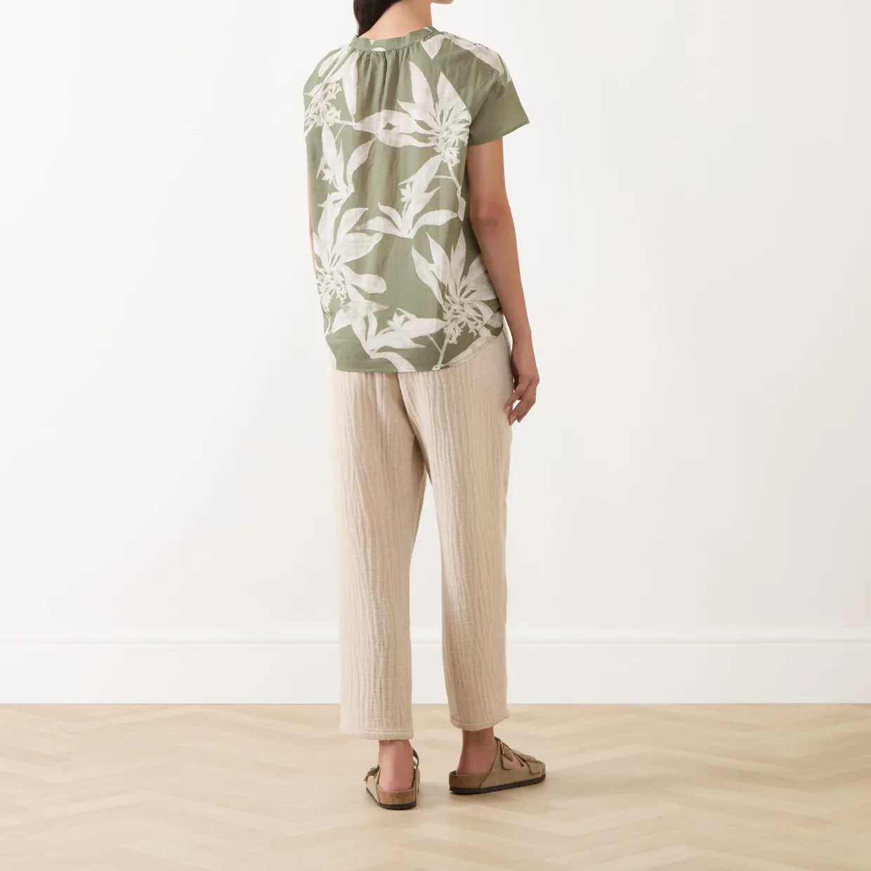 - Notched neckline, standing collar, short sleeves, curved hemline, forest print, seam detail, pleats to the back neckline