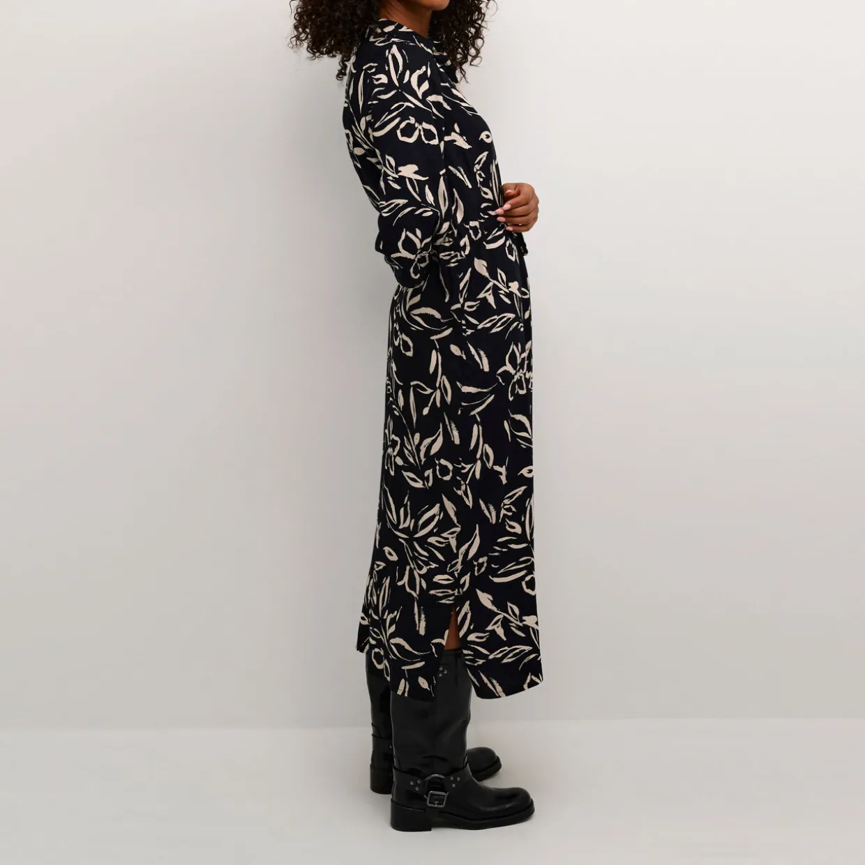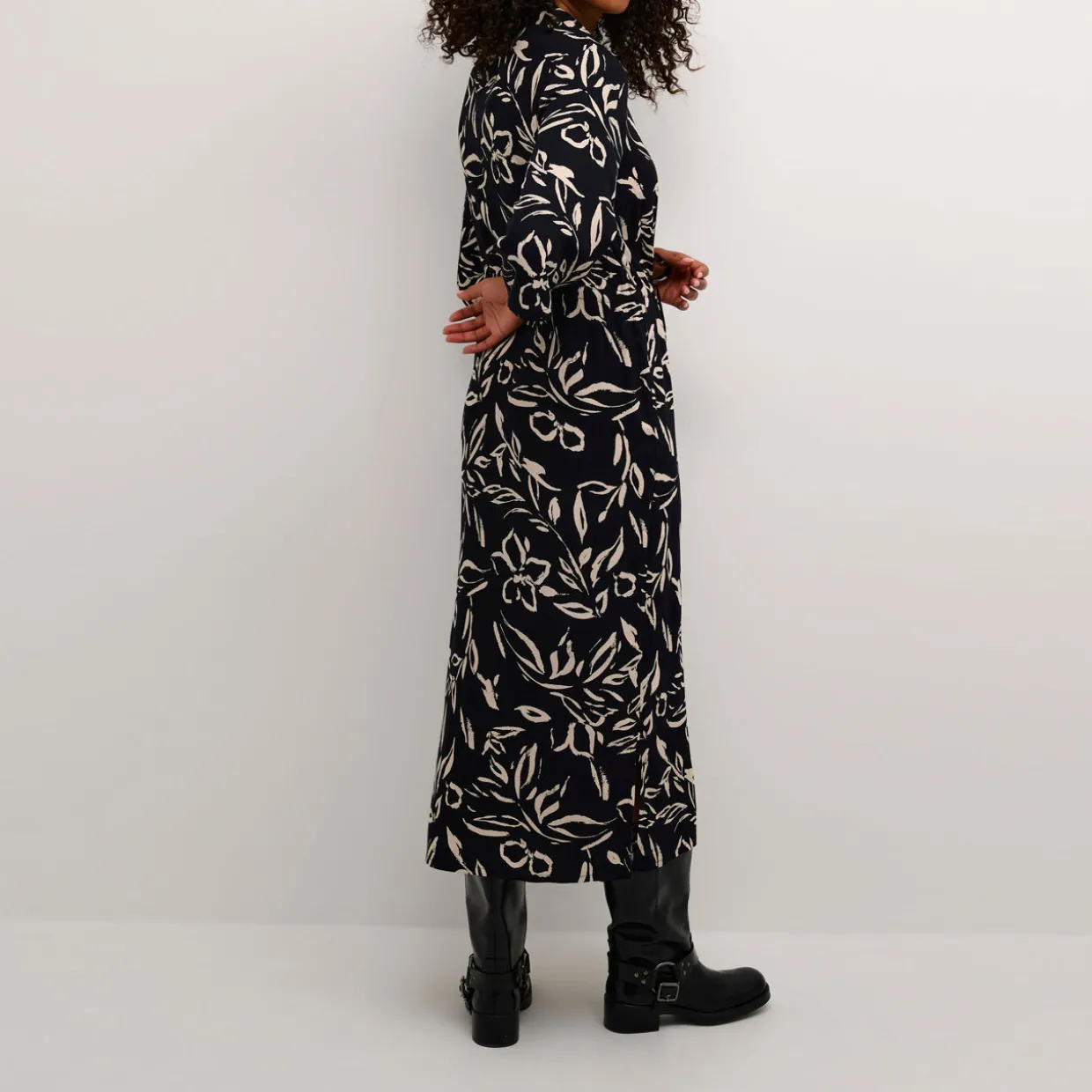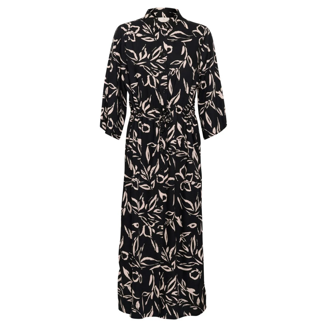 - Point collar, wide three-quarter length sleeves, front button fastening, adjustable waist with drawstring fastening, straight hem, all-over leaf print pattern, midi length