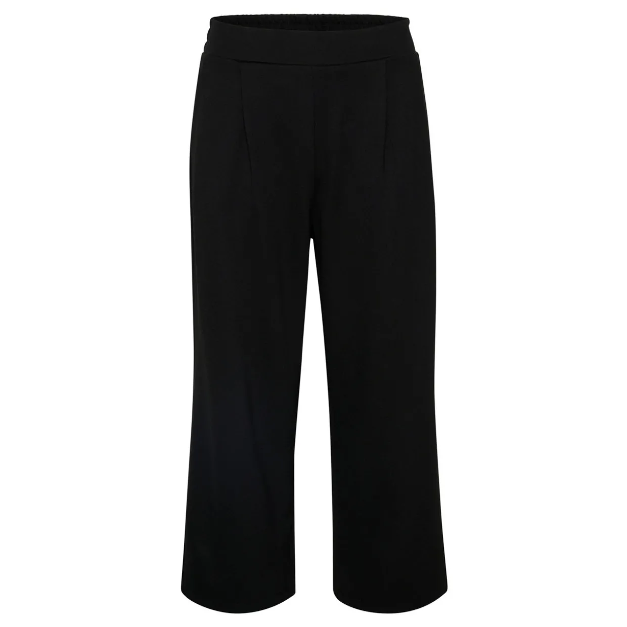 - Elasticated waistband, flared wide-leg silhouette, cropped style, back welt pockets, side seam pockets