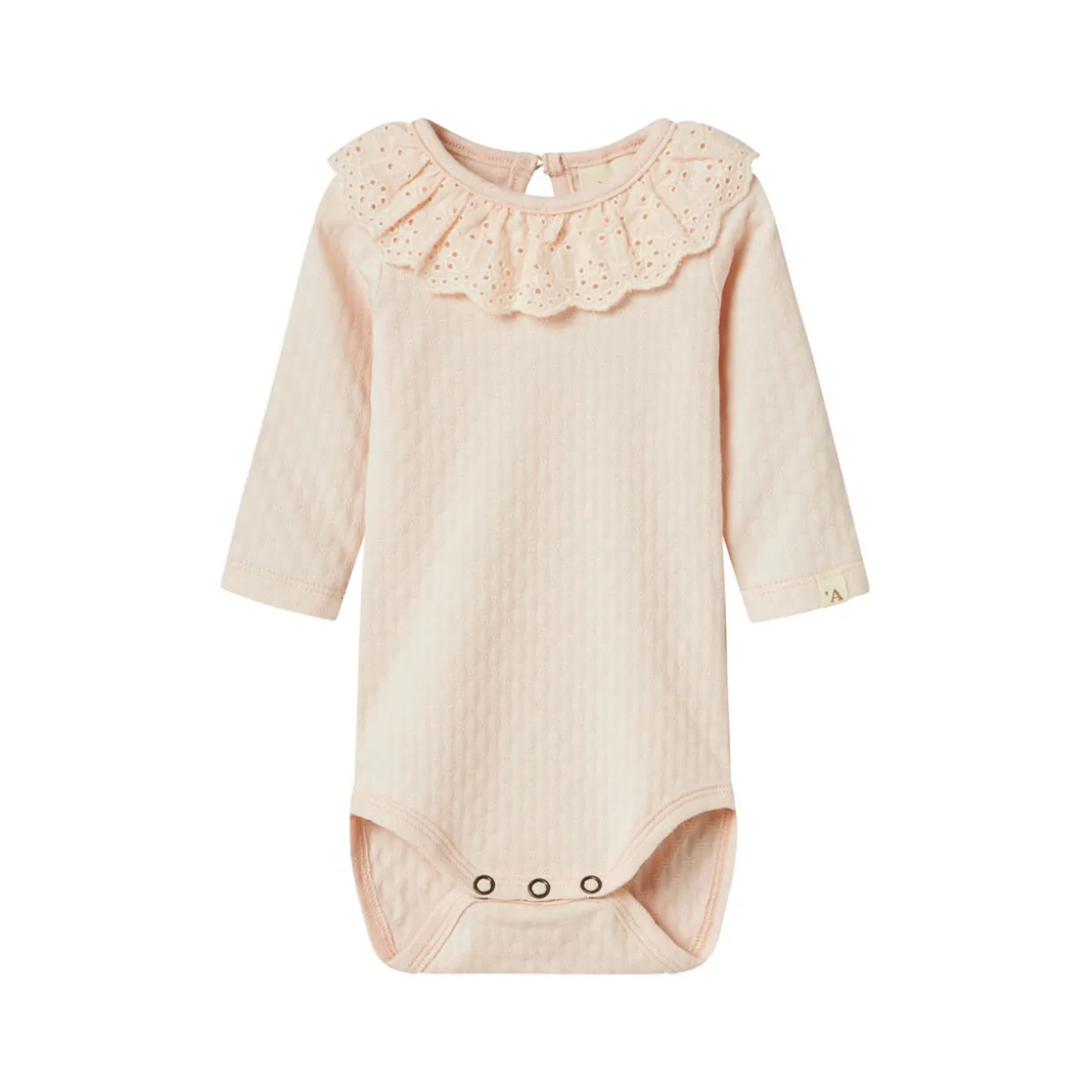 - Long sleeves, round neckline, frill collar, back keyhole and button fastening, snap-button fastening for easy removal, attached logo tag, textured fabric