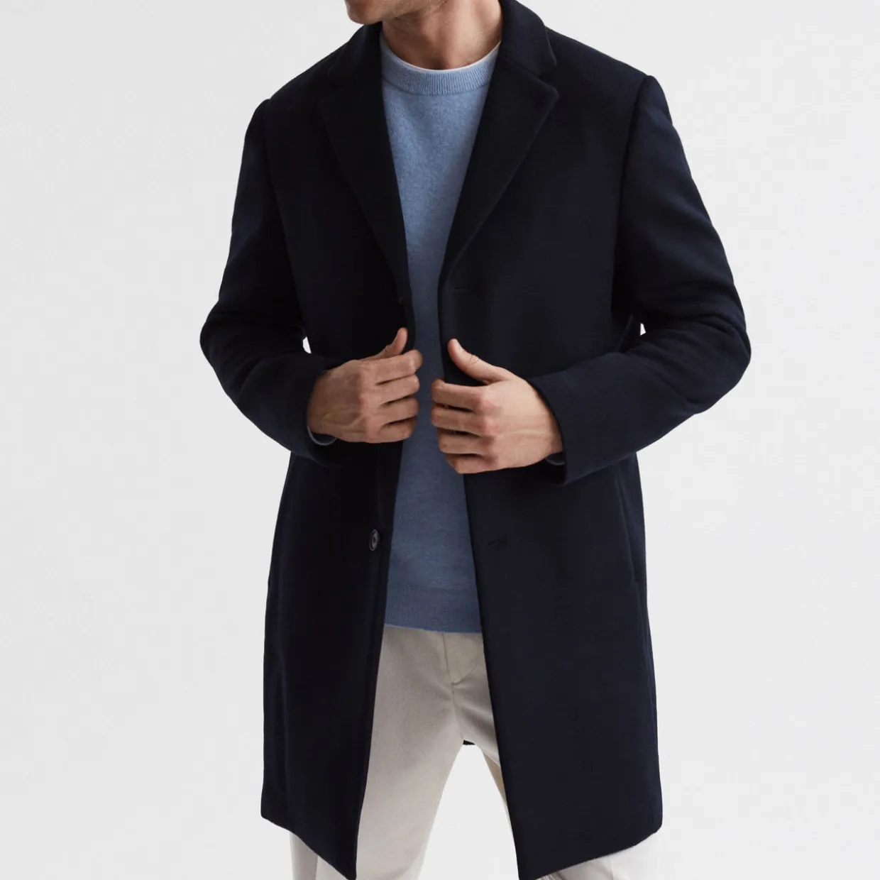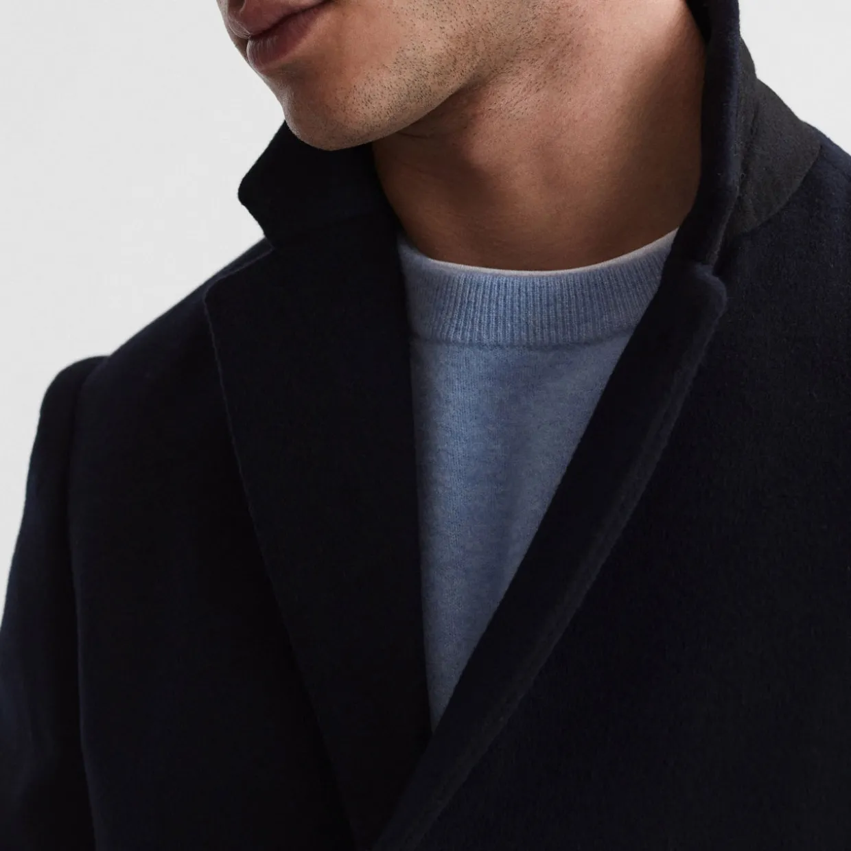 - Wool blend, single-breasted, notch lapels, three-button fastening, long sleeves, side-slip pockets, vent to reverse, lined