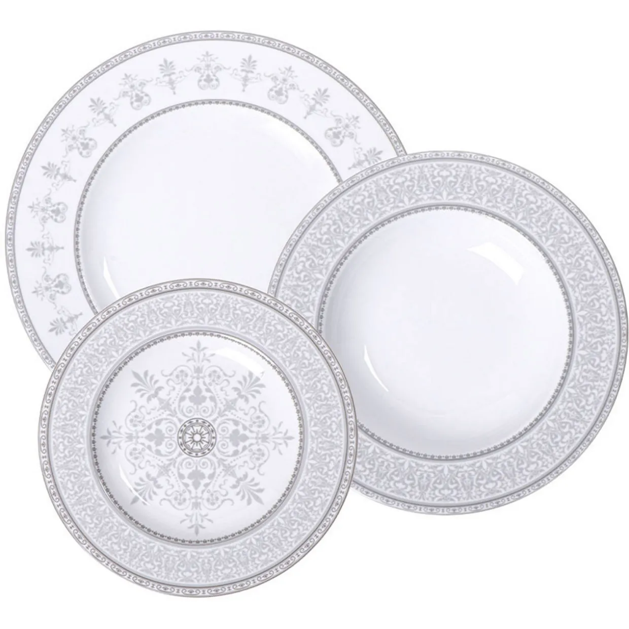 - Set contains 6x dinner plates 28cm, 6x deep plates 23cm, and 6x side plates 21cm, strong and durable porcelain with a top quality glaze, printed