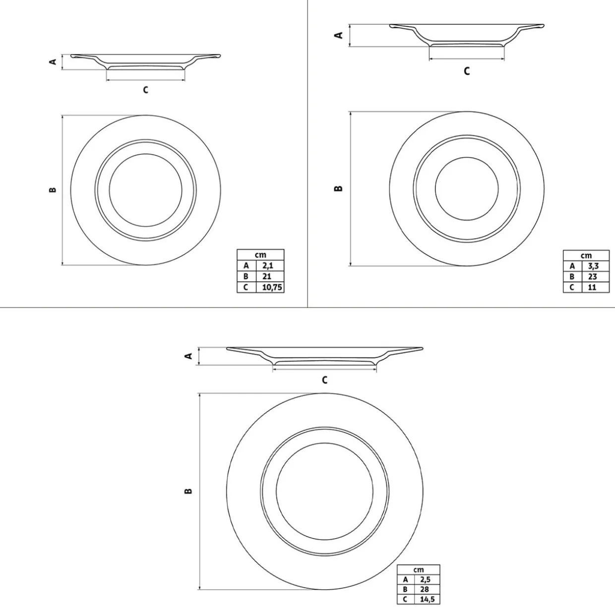 - Dimensions: Dinner plates: 28 x 28 x 2.5cm. Deep plates: 23 x 23 x 3.3cm. Side plates: 21 x 21 x 2.1cm. Overall product weight: 10.87 kg