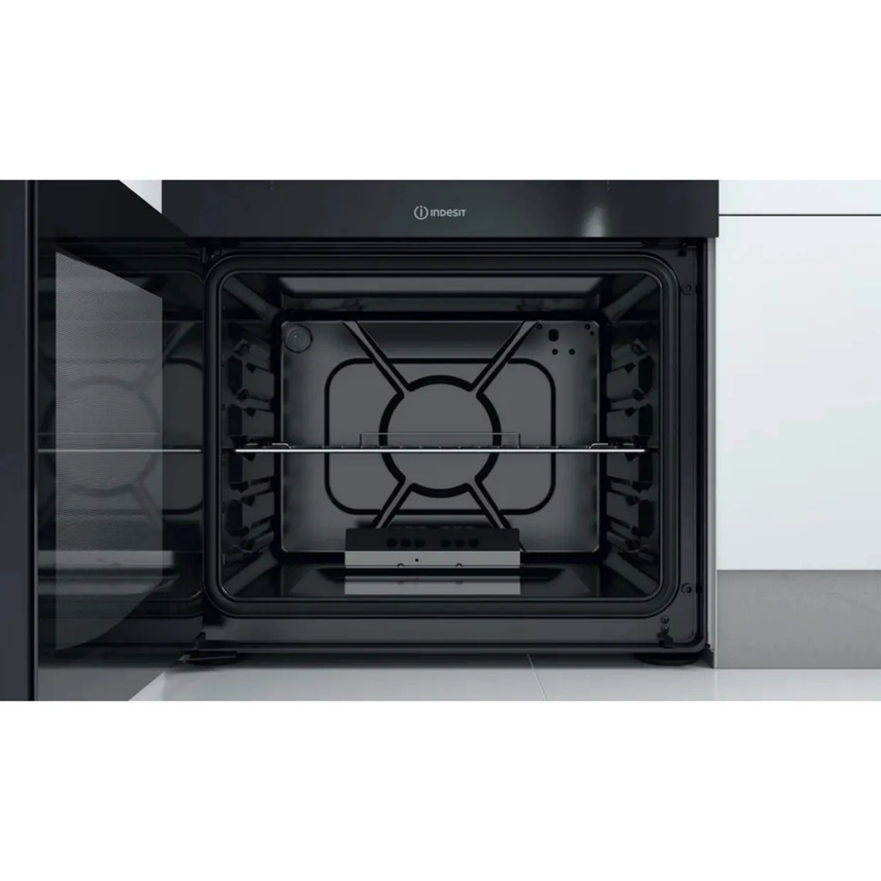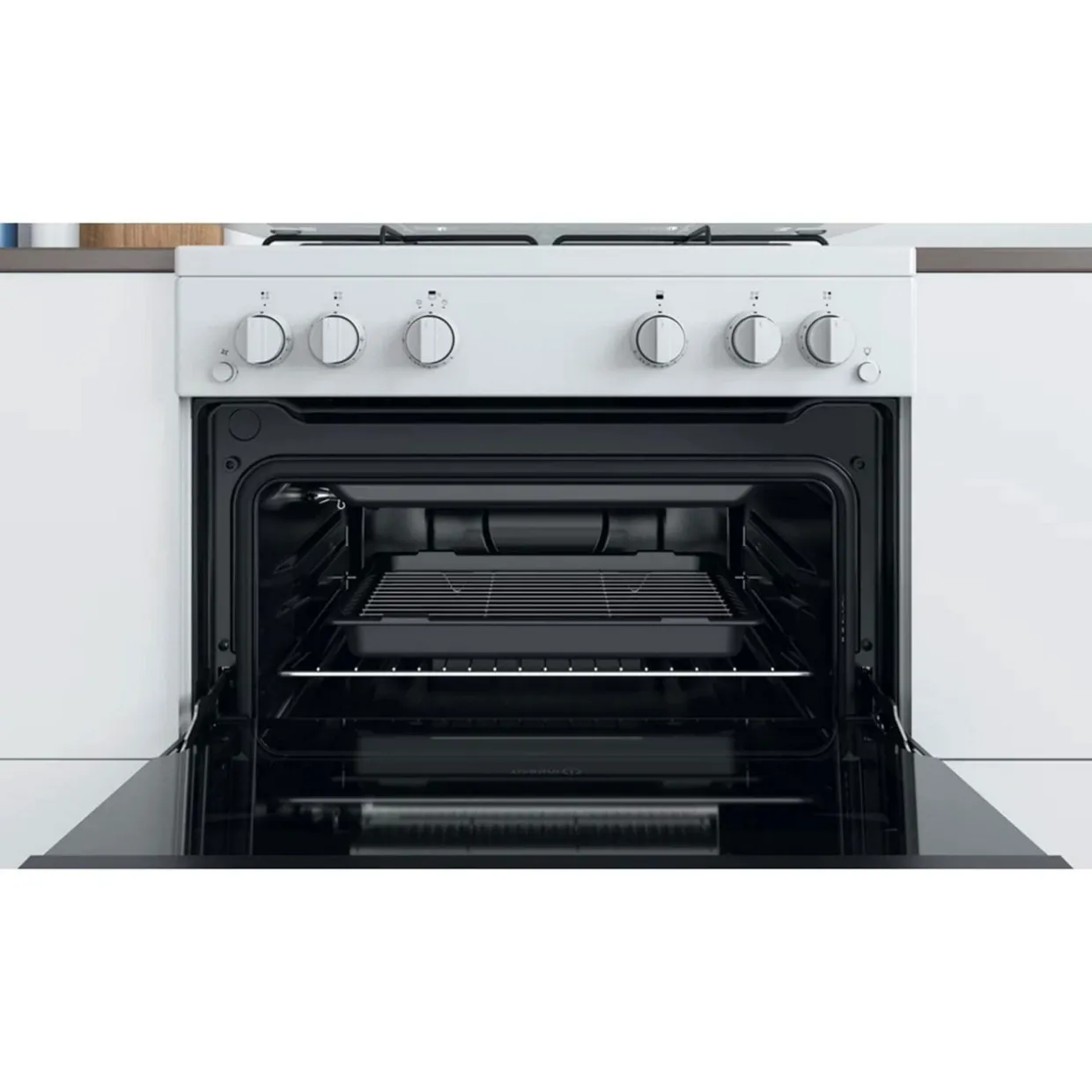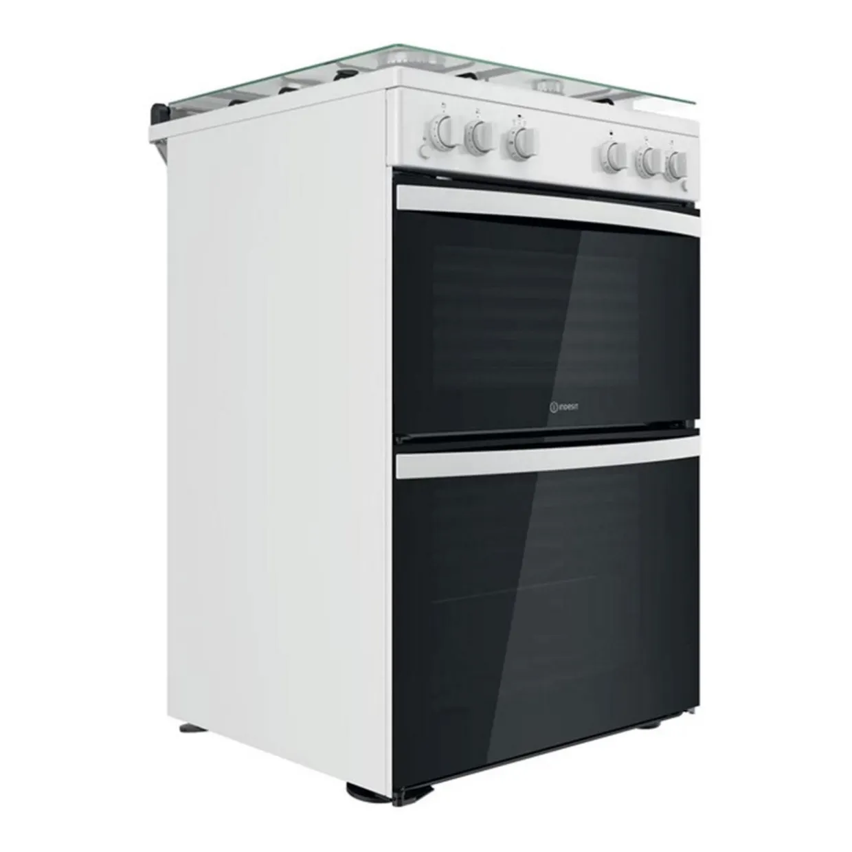 This Indesit freestanding 60×60 double cooker features: 4 gas burners. White colour. Gas power supply. 60cm width.