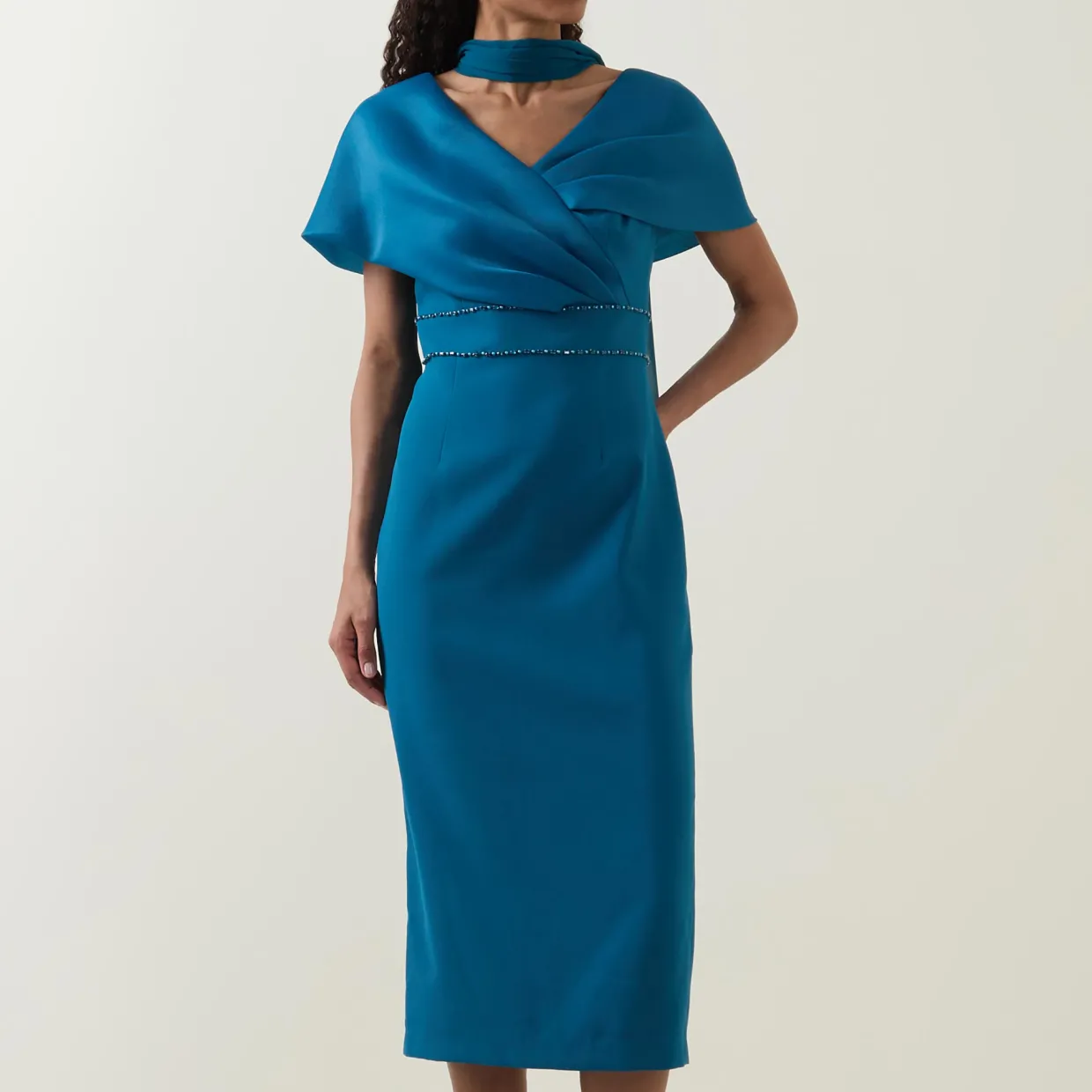 - V-neckline, short sleeves, neck tie, twisted design, gathered bust, embellished detailing around the waist, rear zip fastening, straight hem, midi length, smooth finish