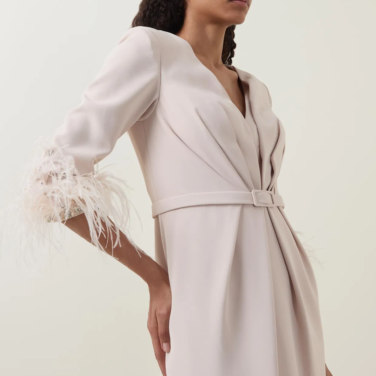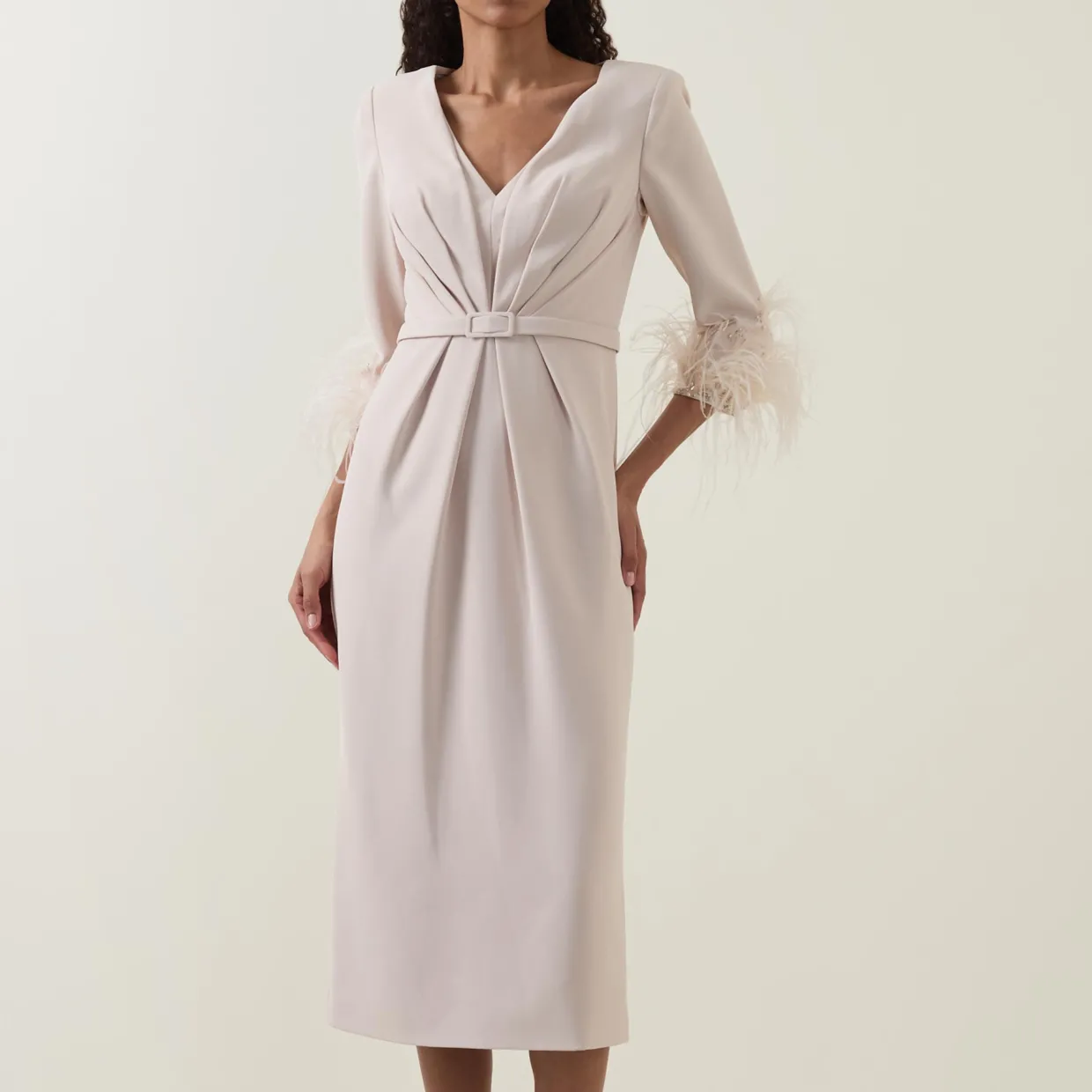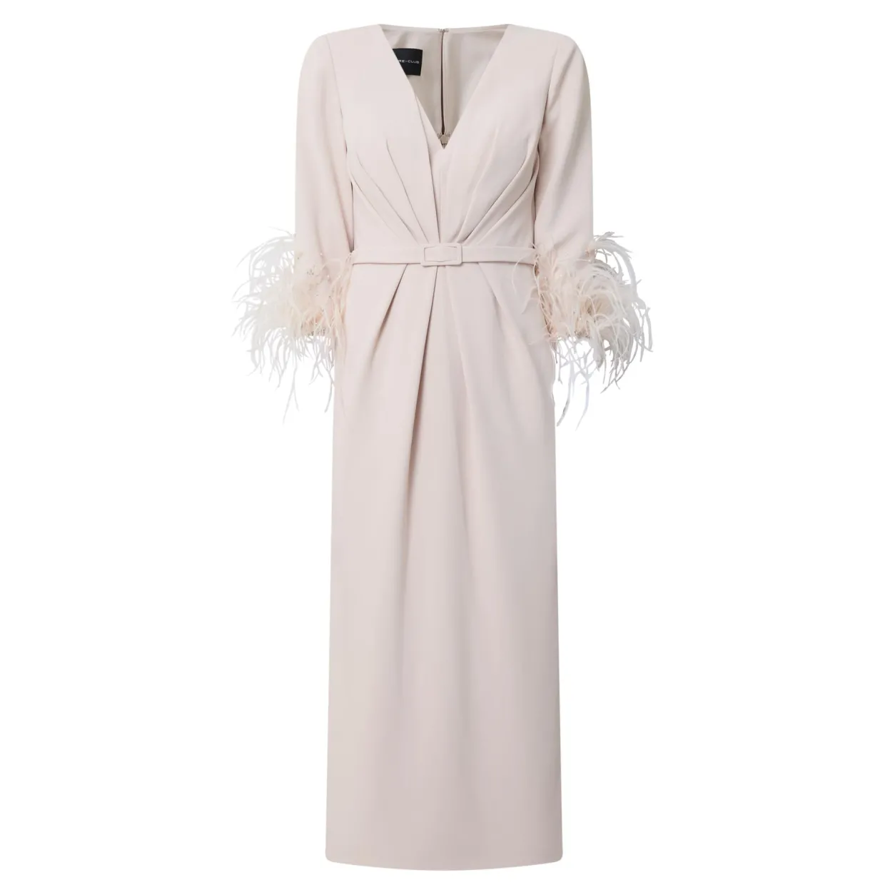 - V-neckline, three-quarter sleeves, feather-trim detailing, gathered design, rear zip closure, matching buckle fastening around the waist, straight hem, rear vent, midi length, smooth finish