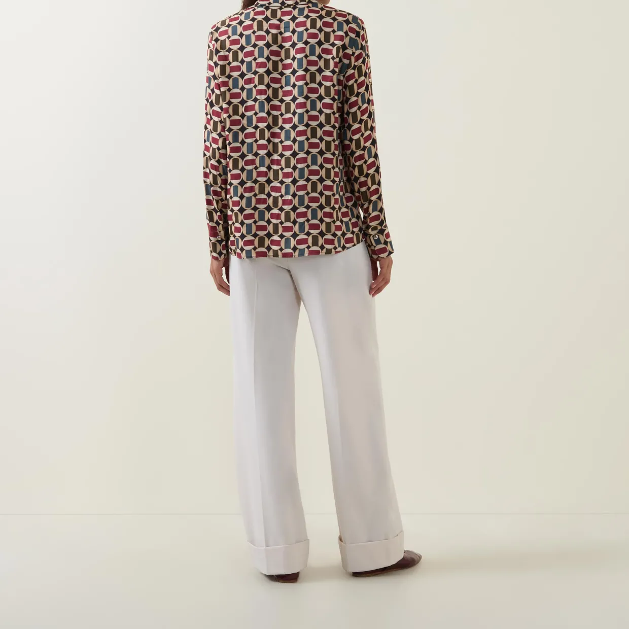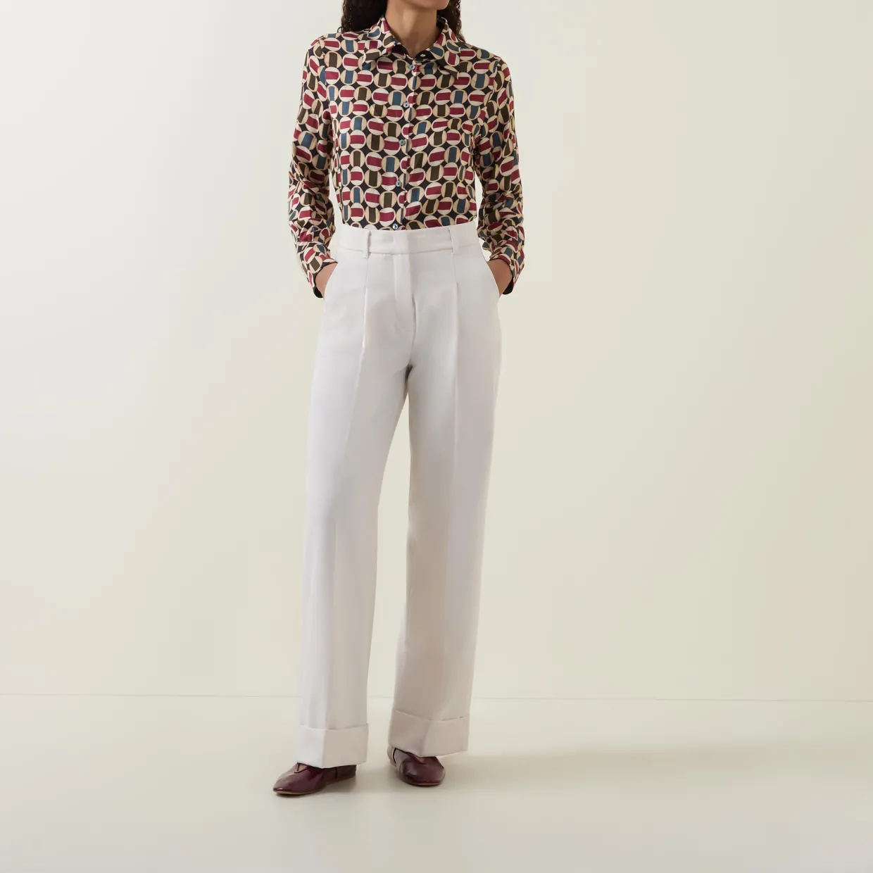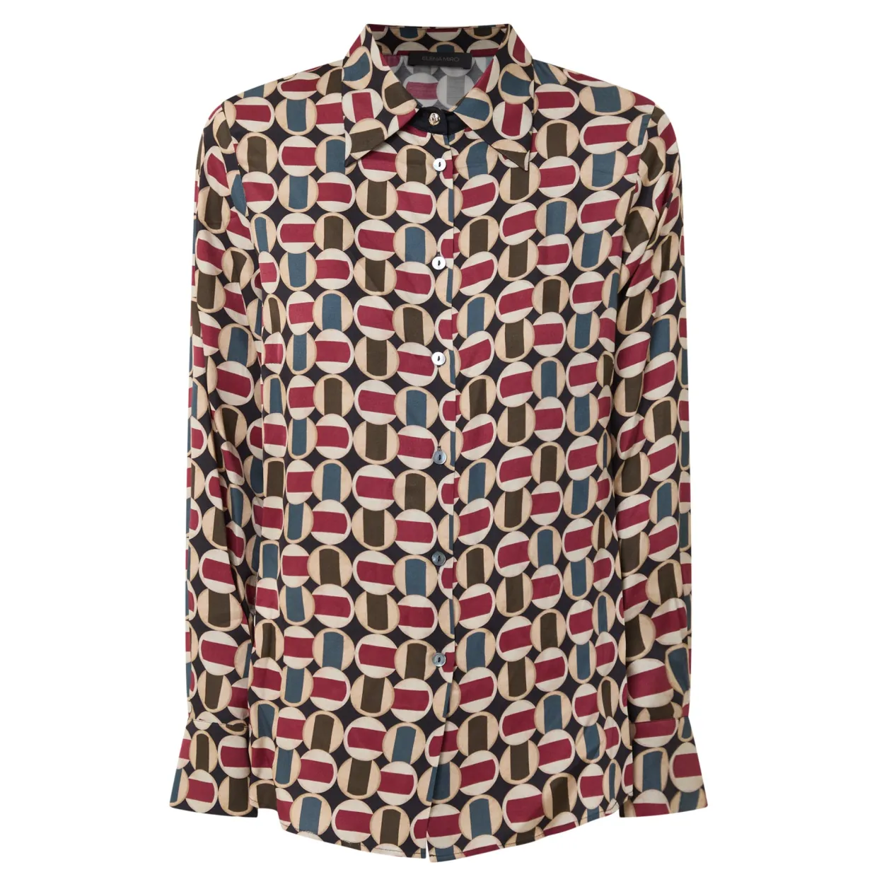 - Point collar, long sleeves, buttoned cuffs, front button fastening, curved hem, geometric pattern, smooth finish