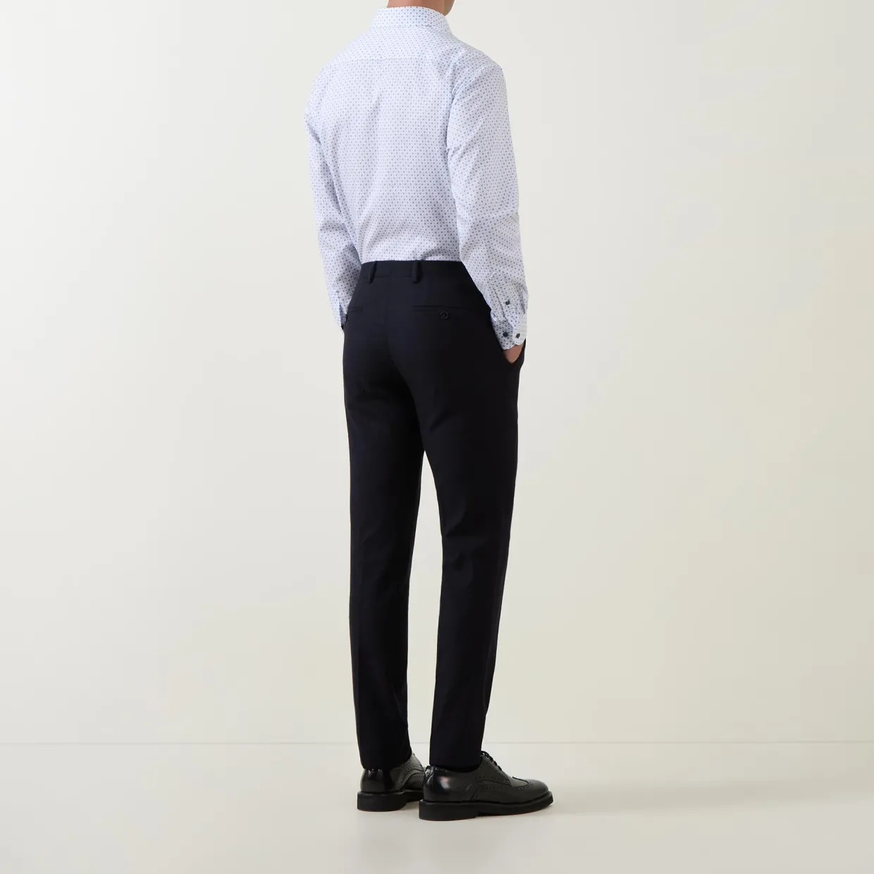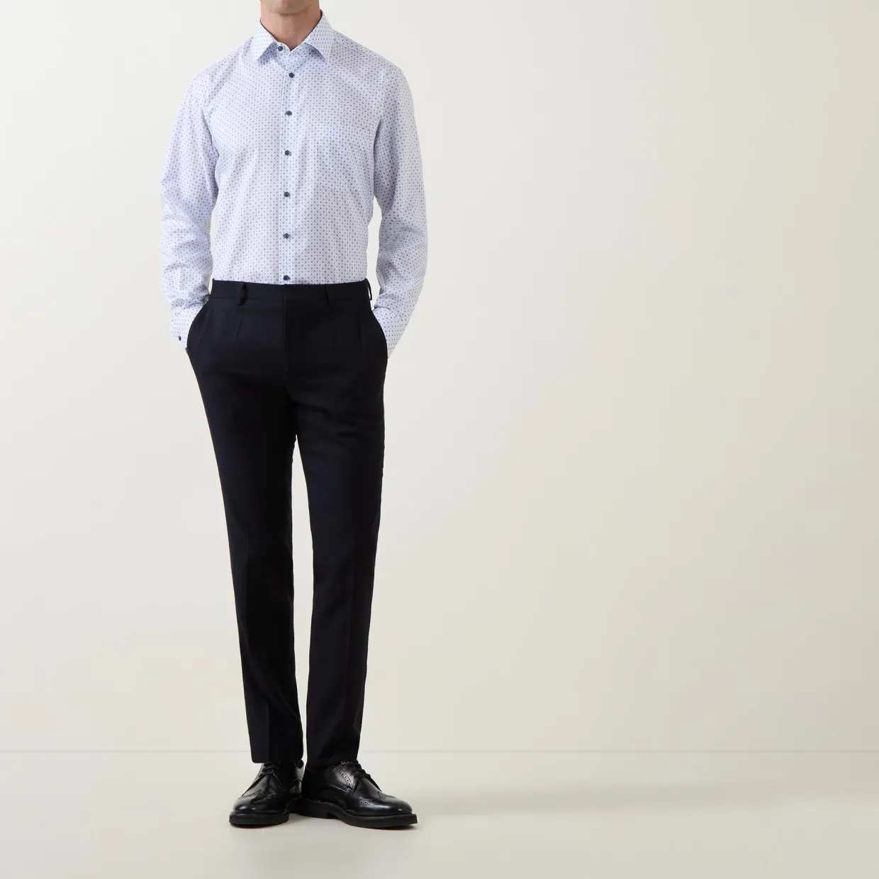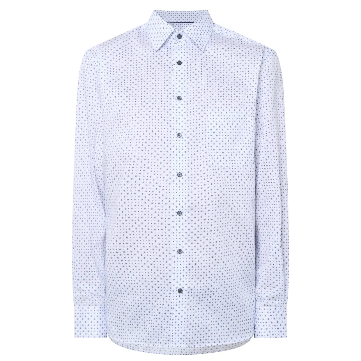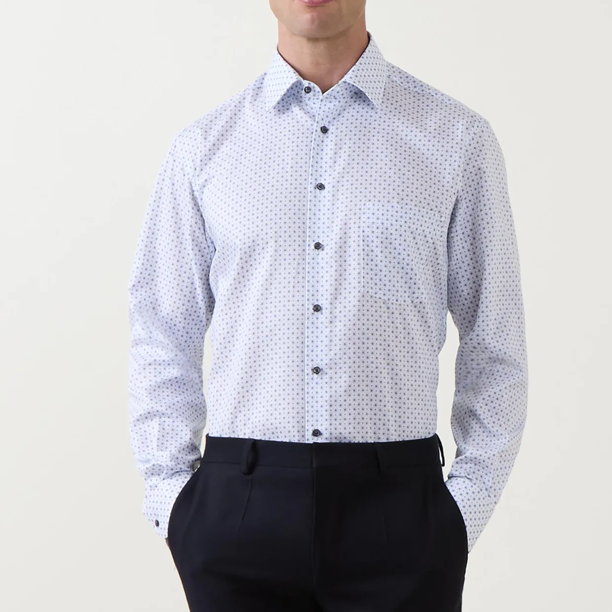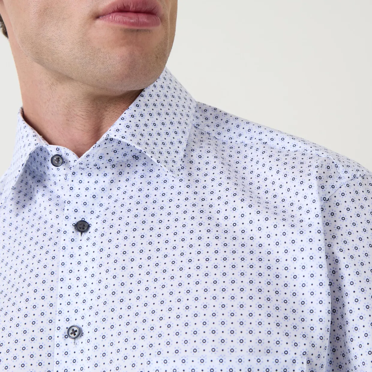 - Geometric print, pointed collar, long sleeves, single cuffs, button fastenings, curved hemline