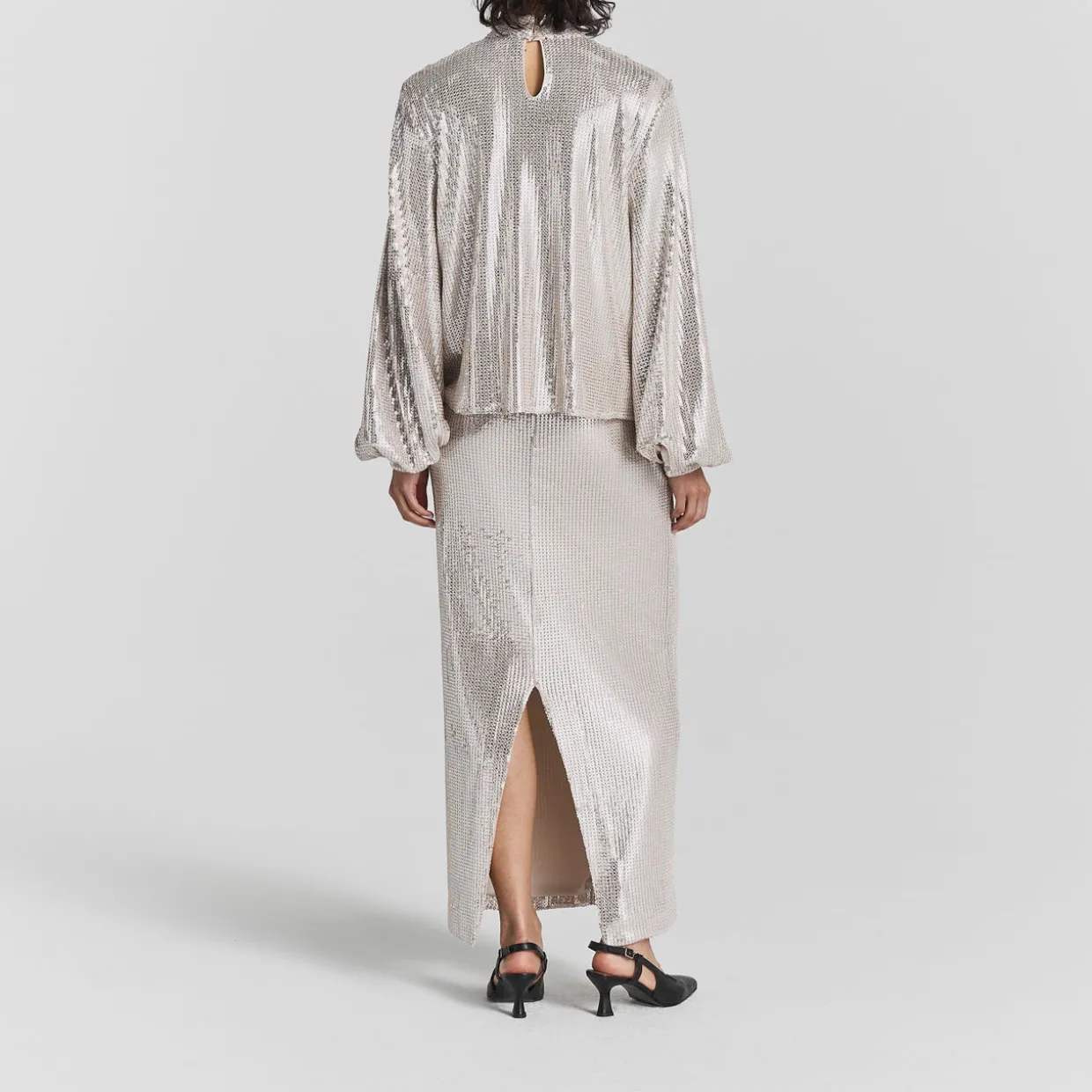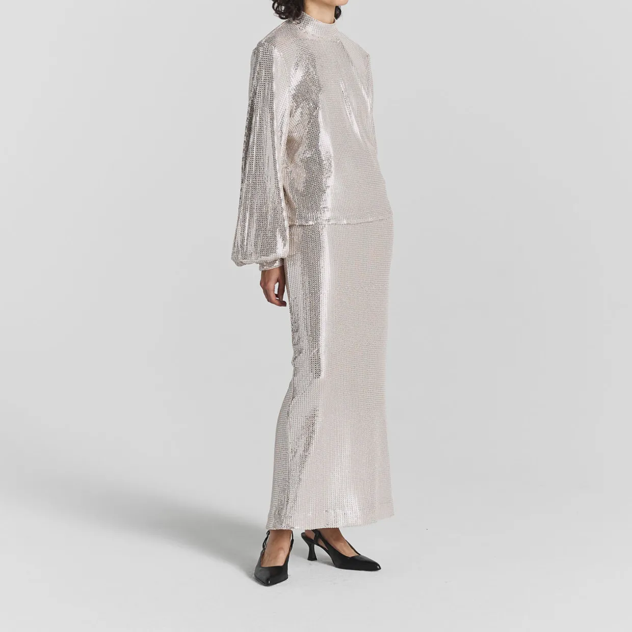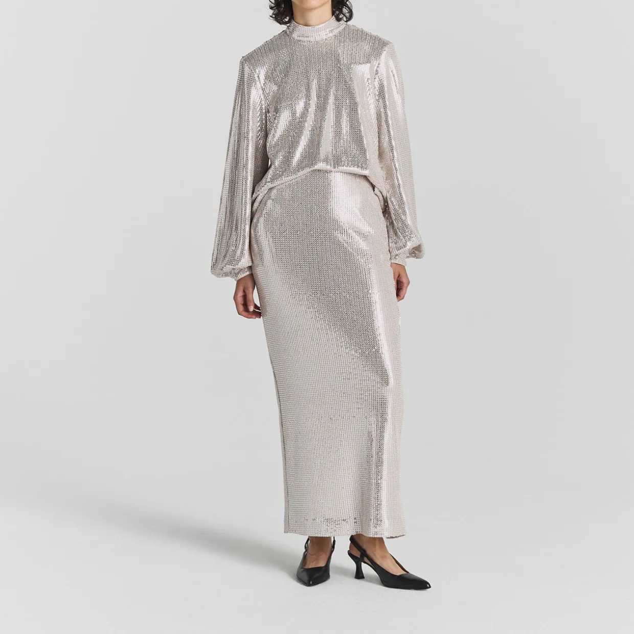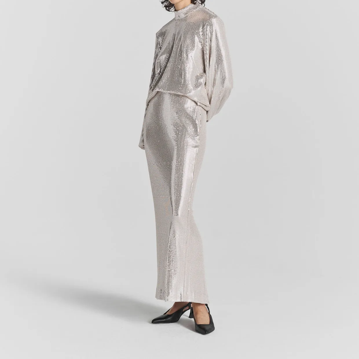 - High-rise, elasticated waistband, straight hem, rear vent, bias-cut, all-over sequin-embellished design, maxi length