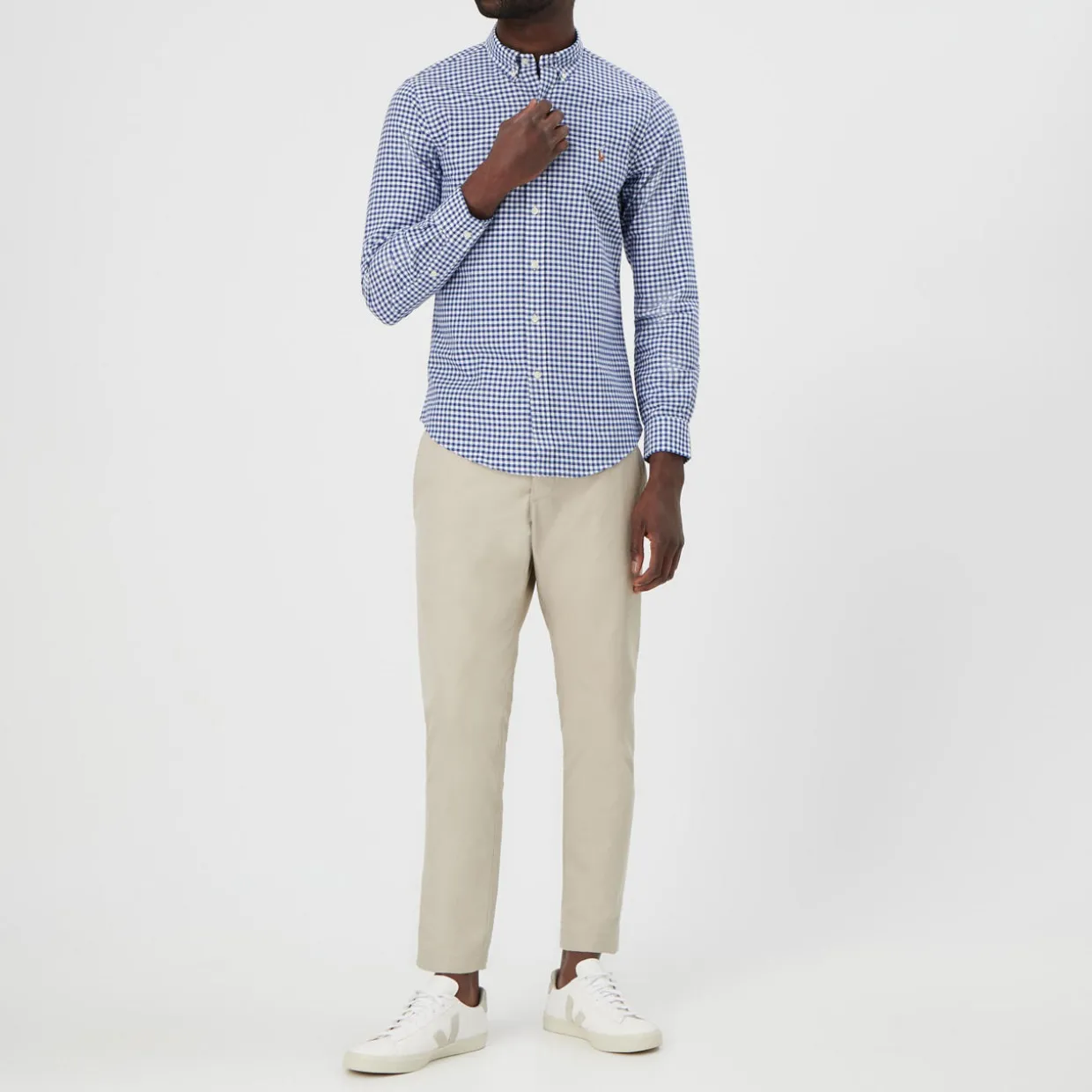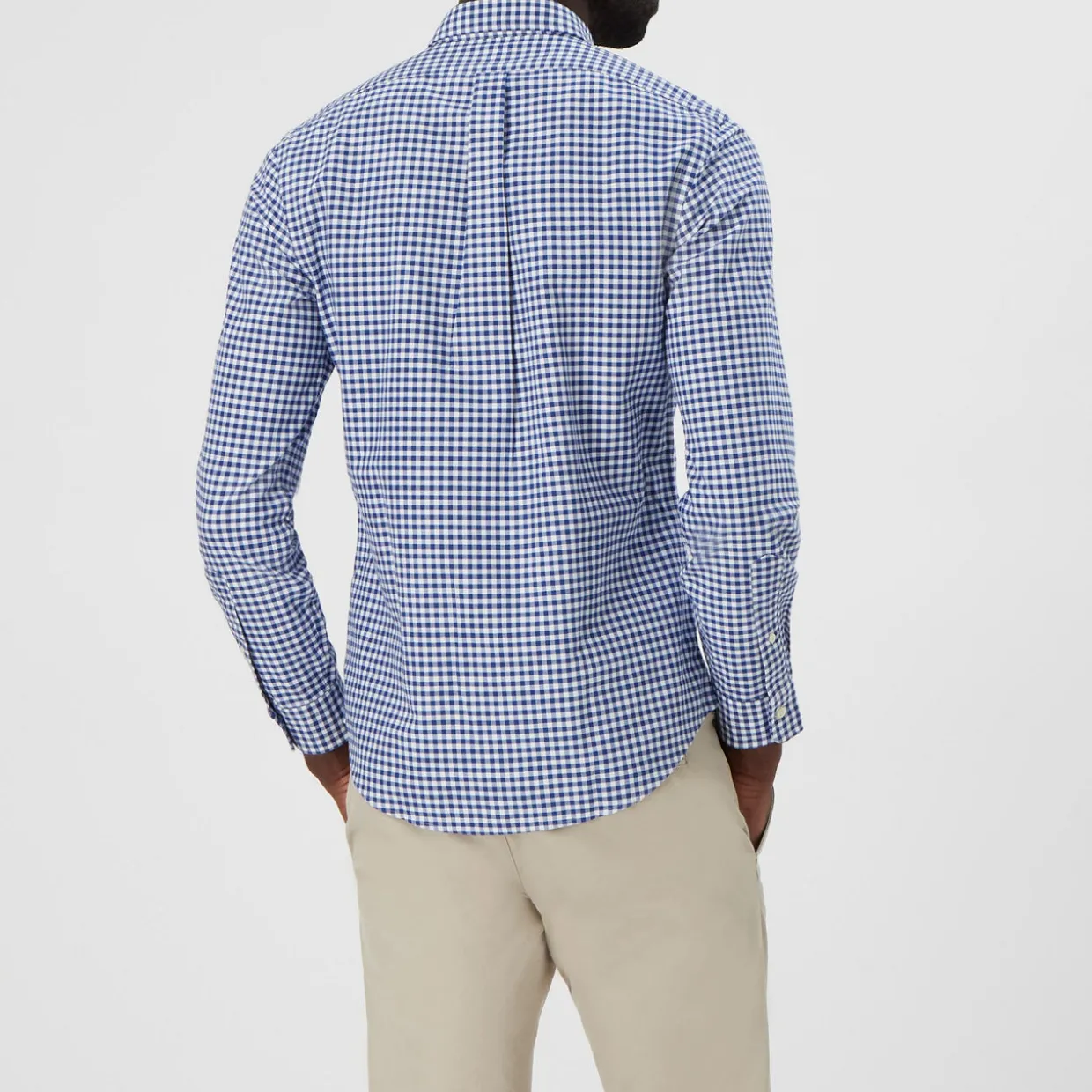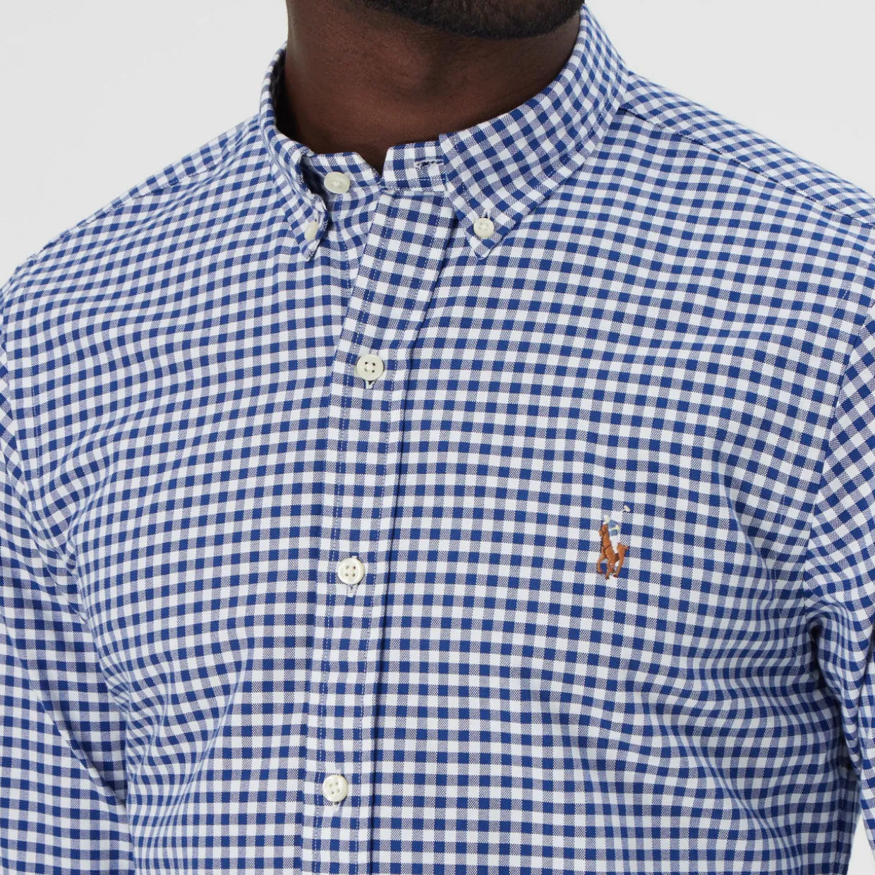 - Button-down collar, pearlescent buttons, oxford, single cuffs, embroidered logo symbol, curved hem, rear box pleat.