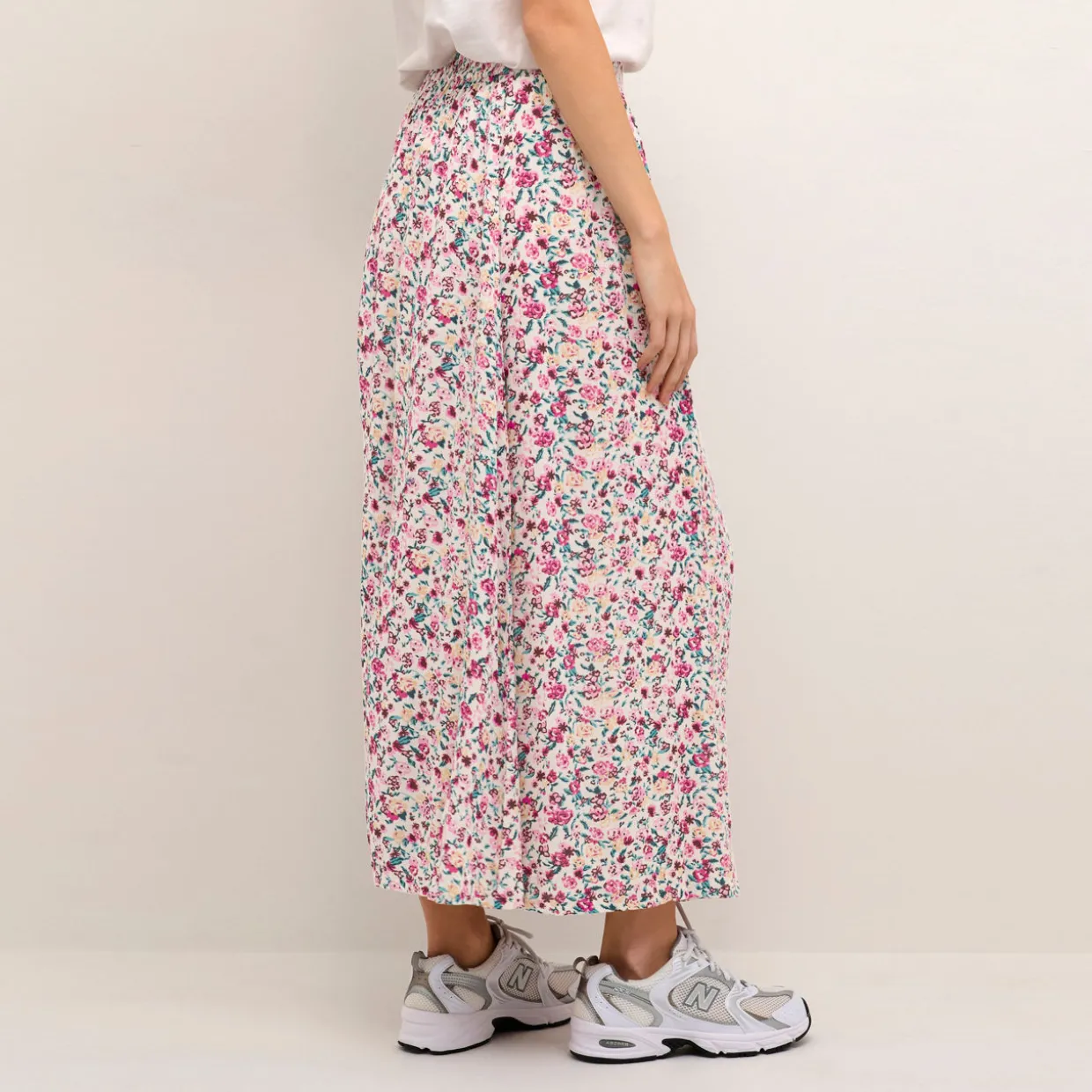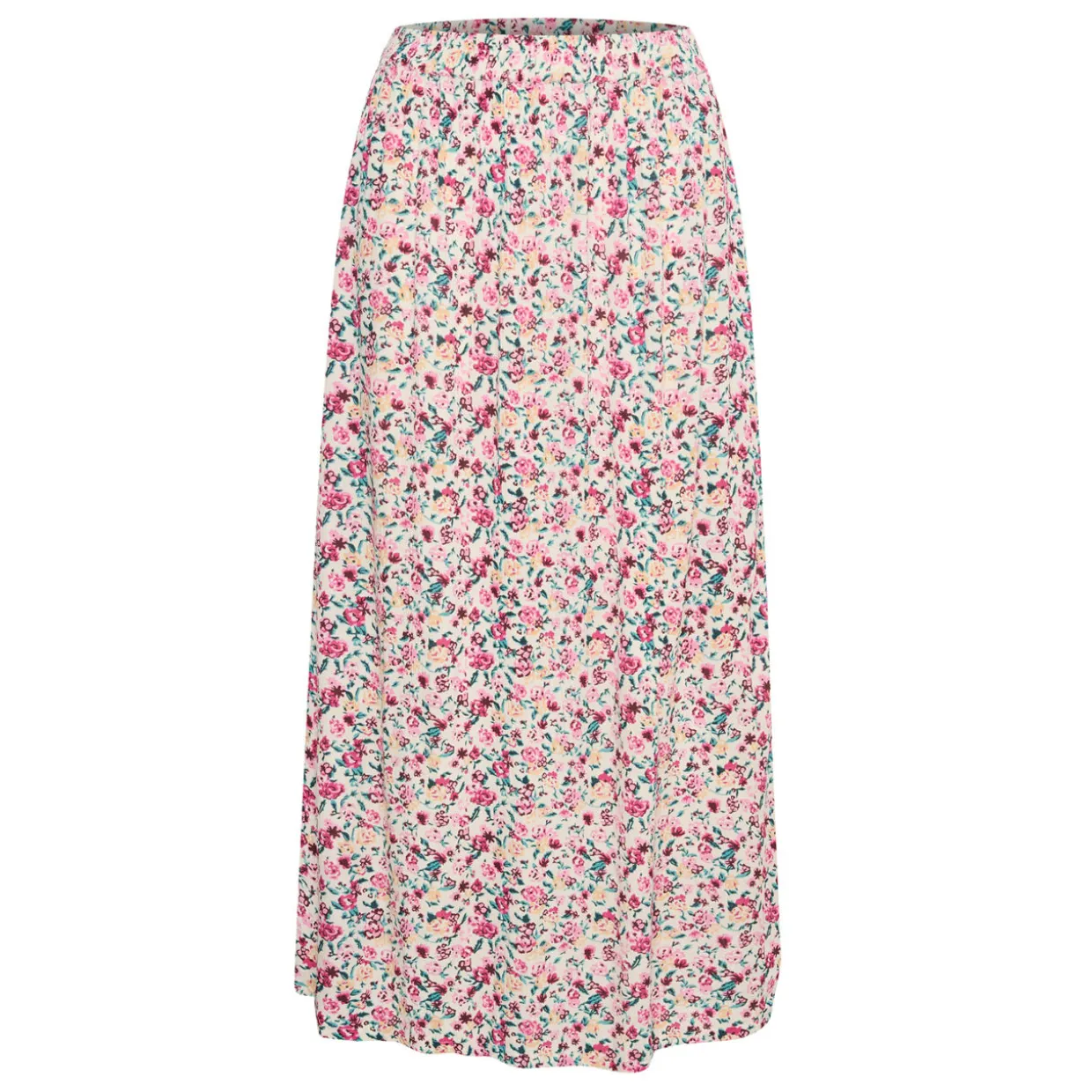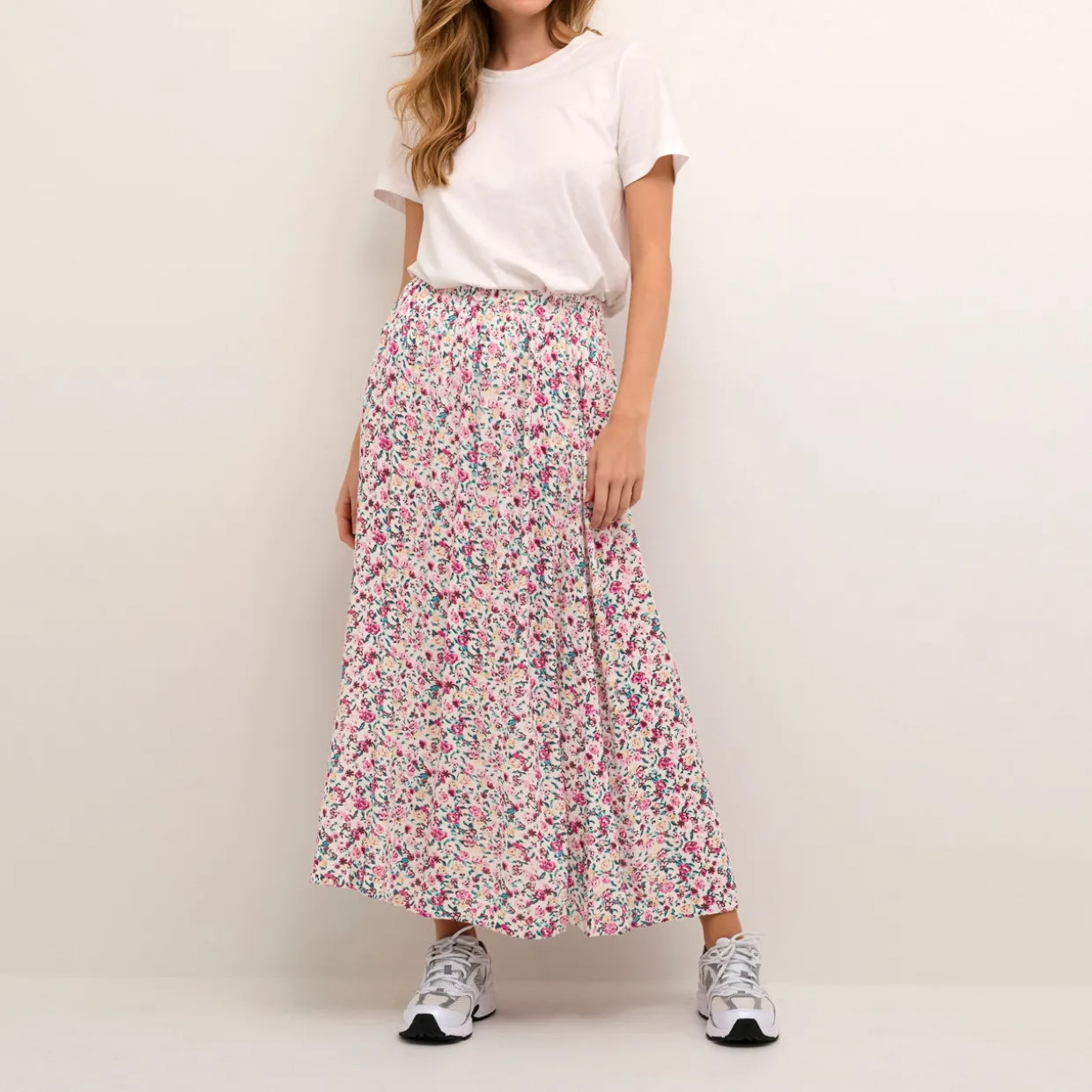 - Floral print, elasticated waistband, high-rise, maxi length, flared silhouette