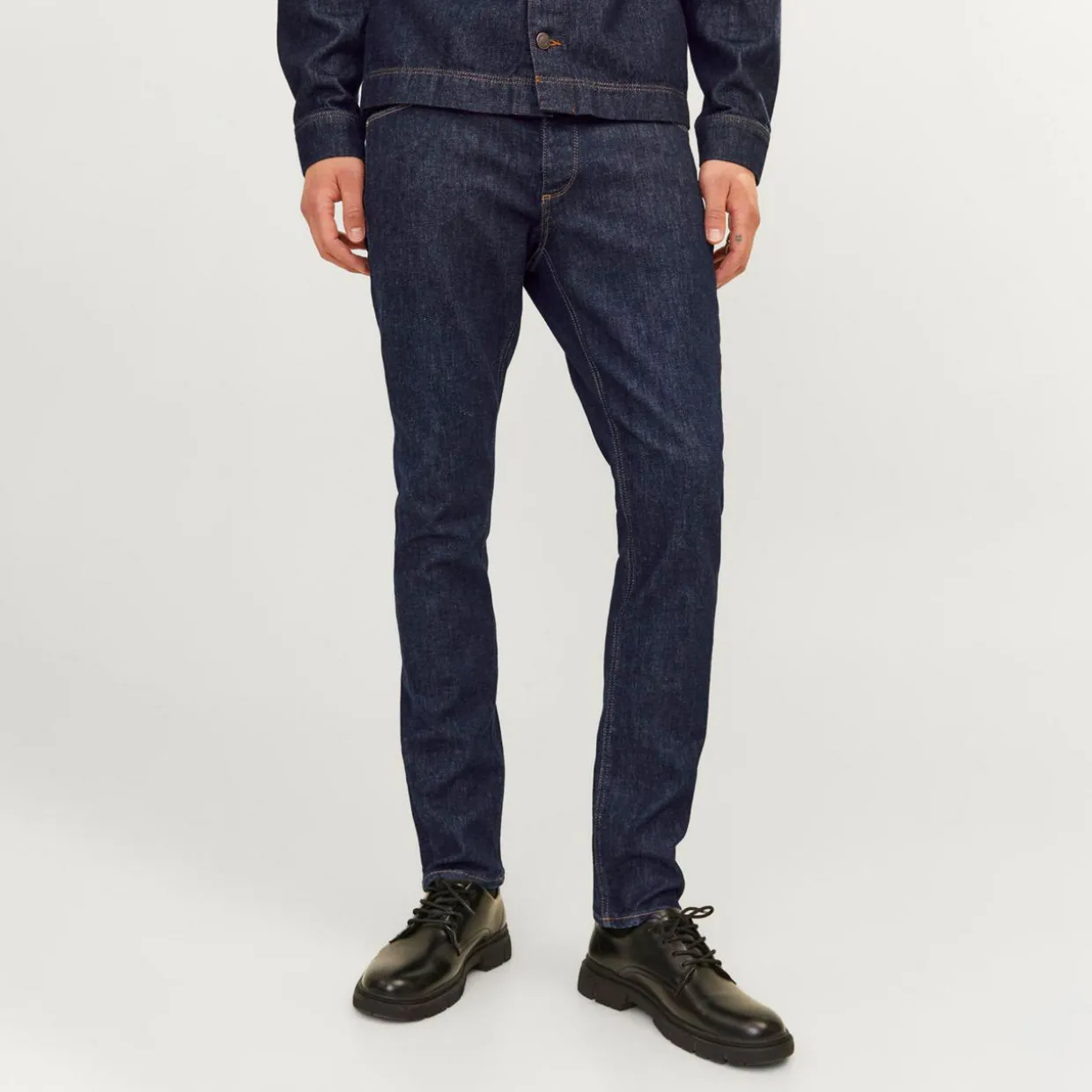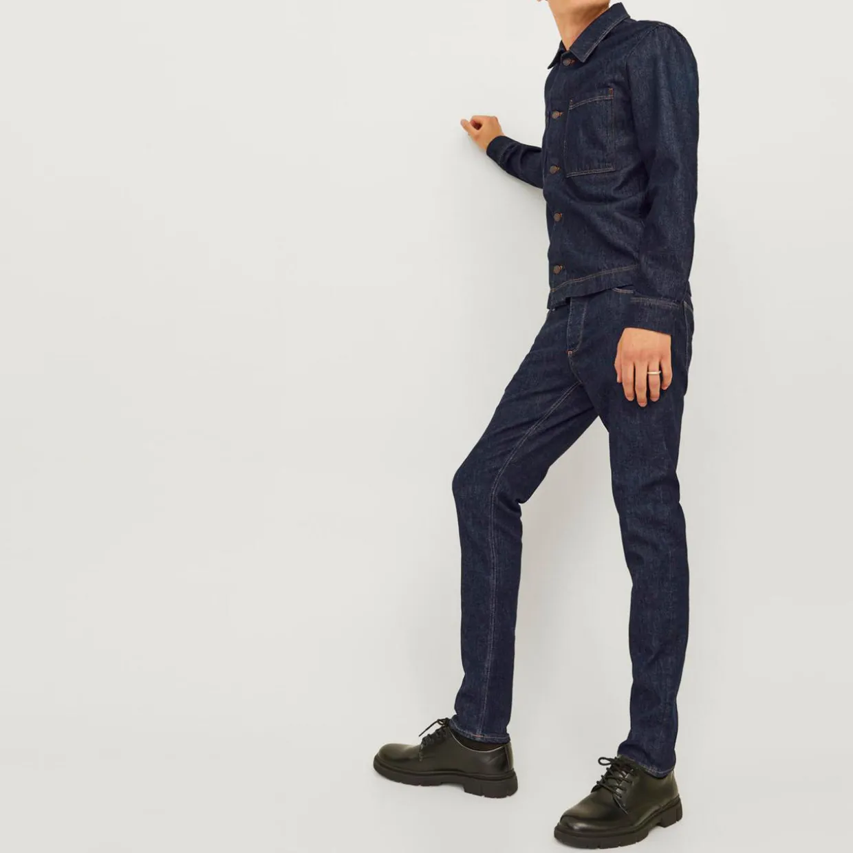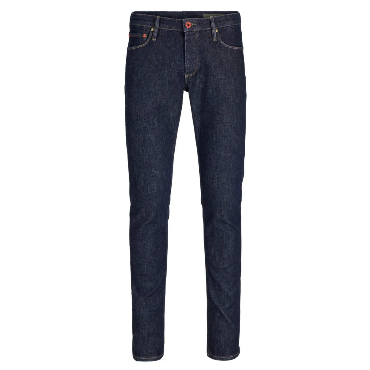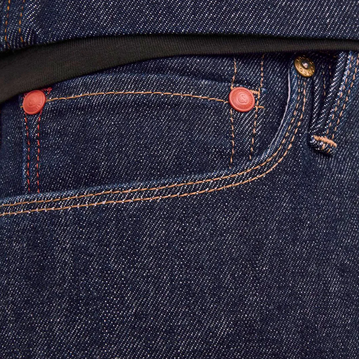 - Button and fly zipper fastening, belt loops, five pocket design, logo badge